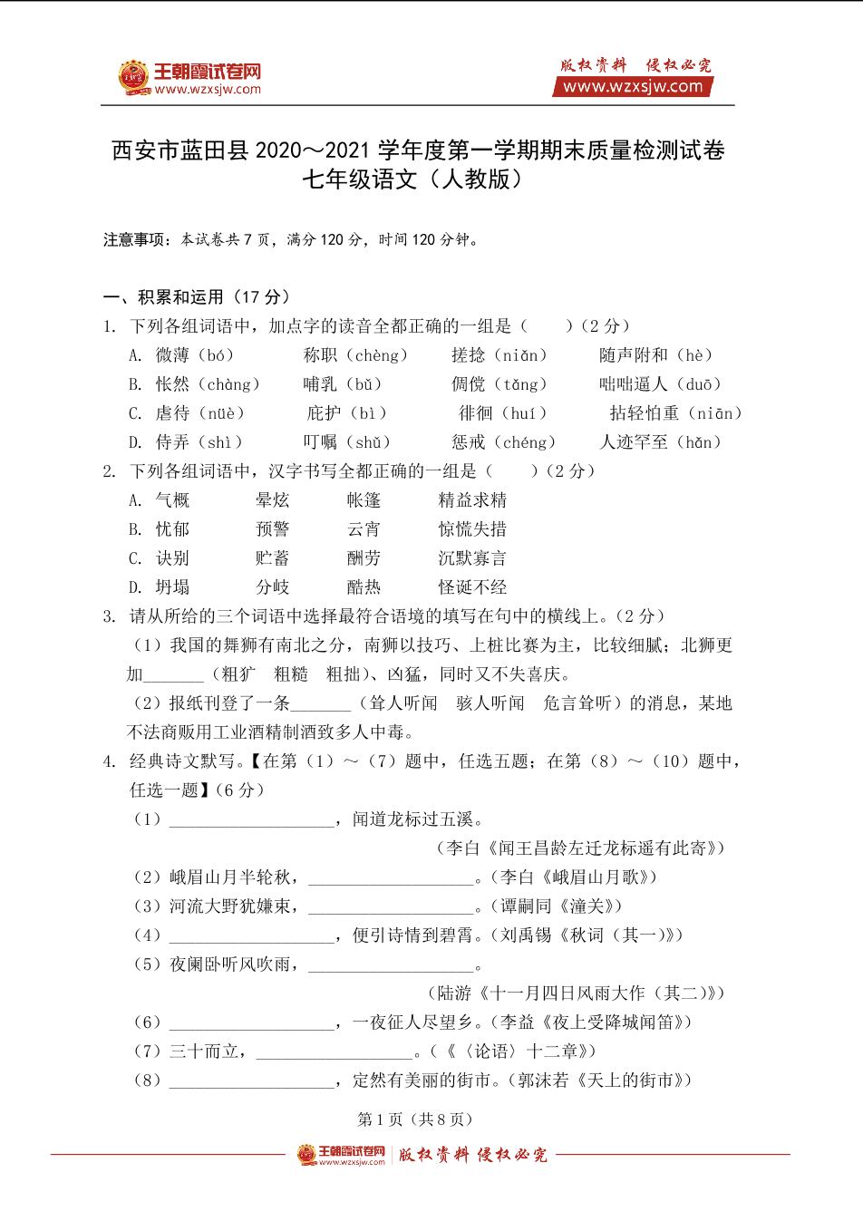 西安市蓝田县2020~2021学年度七年级第一学期期末质量检测语文试卷(人教版)