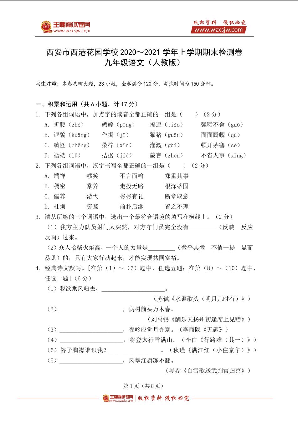 西安市西港花园学校2020~2021学年上学期期末检测卷九年级语文(人教版)