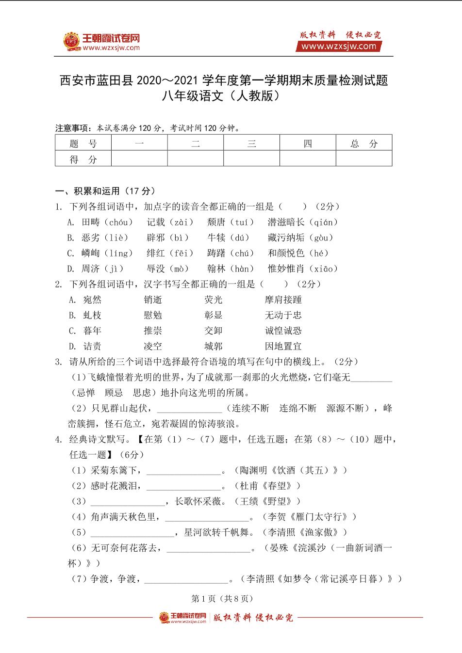 西安市蓝田县2020~2021学年度八年级第一学期期末质量检测语文试题(人教版)
