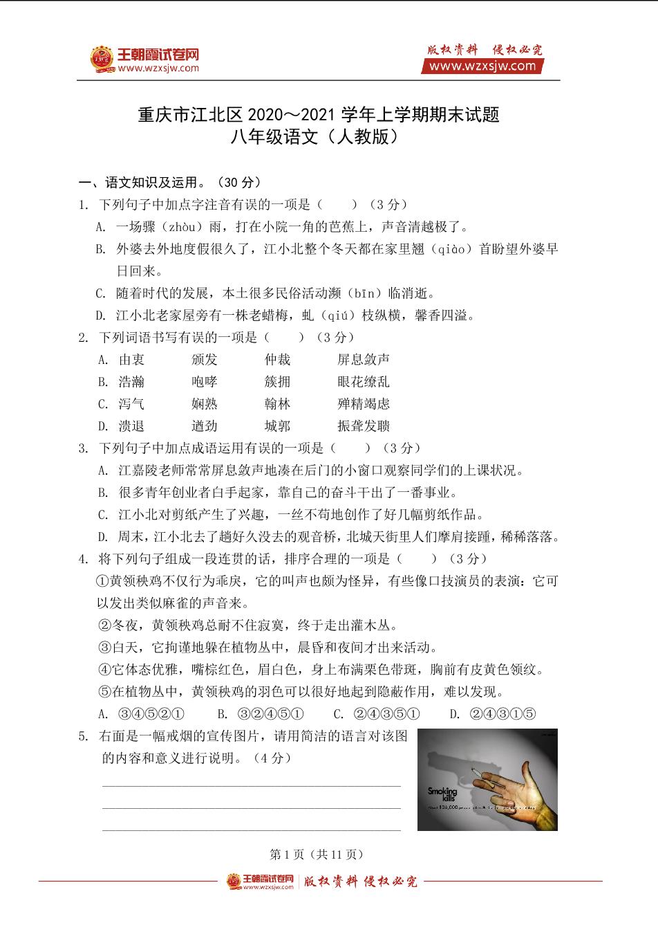 重庆市江北区2020~2021学年上学期期末试题八年级语文(人教版)