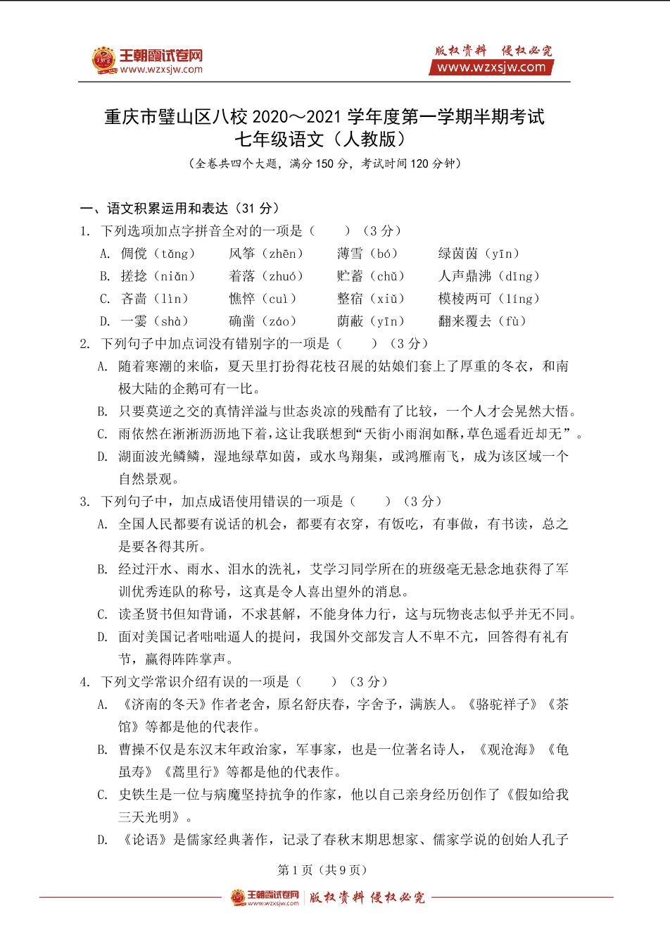 重庆市璧山区八校2020~2021学年度第一学期半期考试七年级语文(人教版)