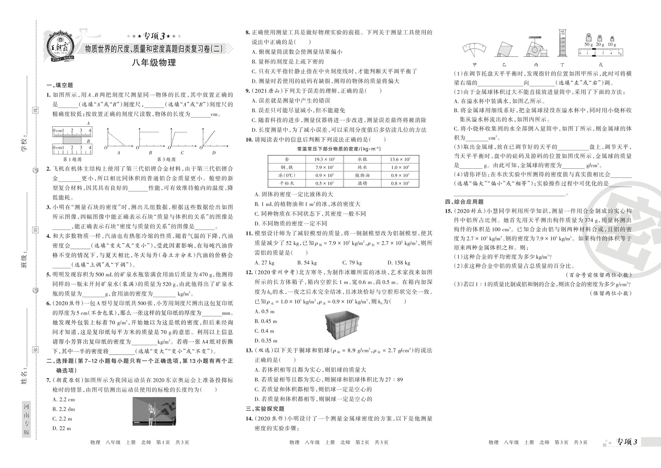 王朝霞期末专项卷——物质世界的尺度、质量和密度真题归类复习卷(二)八年级上册物理(北师版)【3】