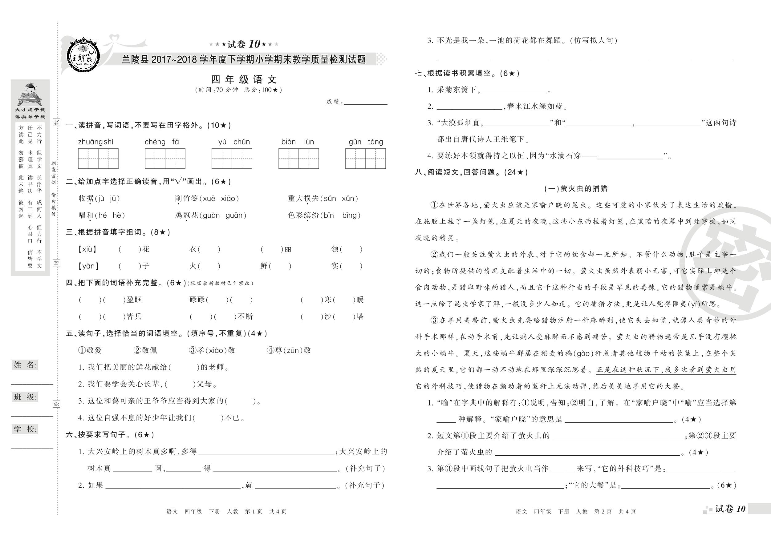 2017-2018学年第二学期临沂市兰陵县四年级语文试卷(人教版)【10】
