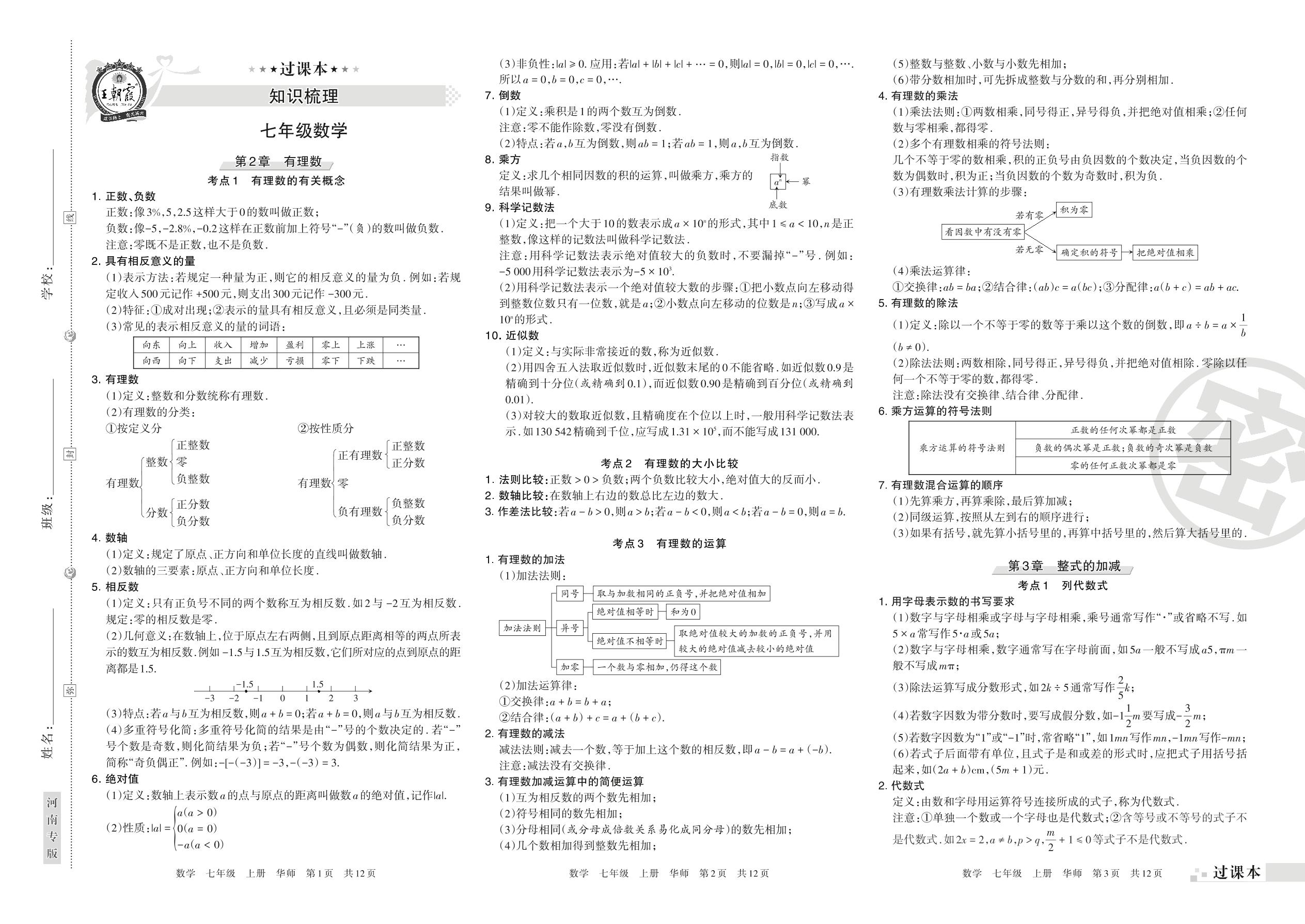 王朝霞期末过课本——知识梳理七年级上册数学(华师版)
