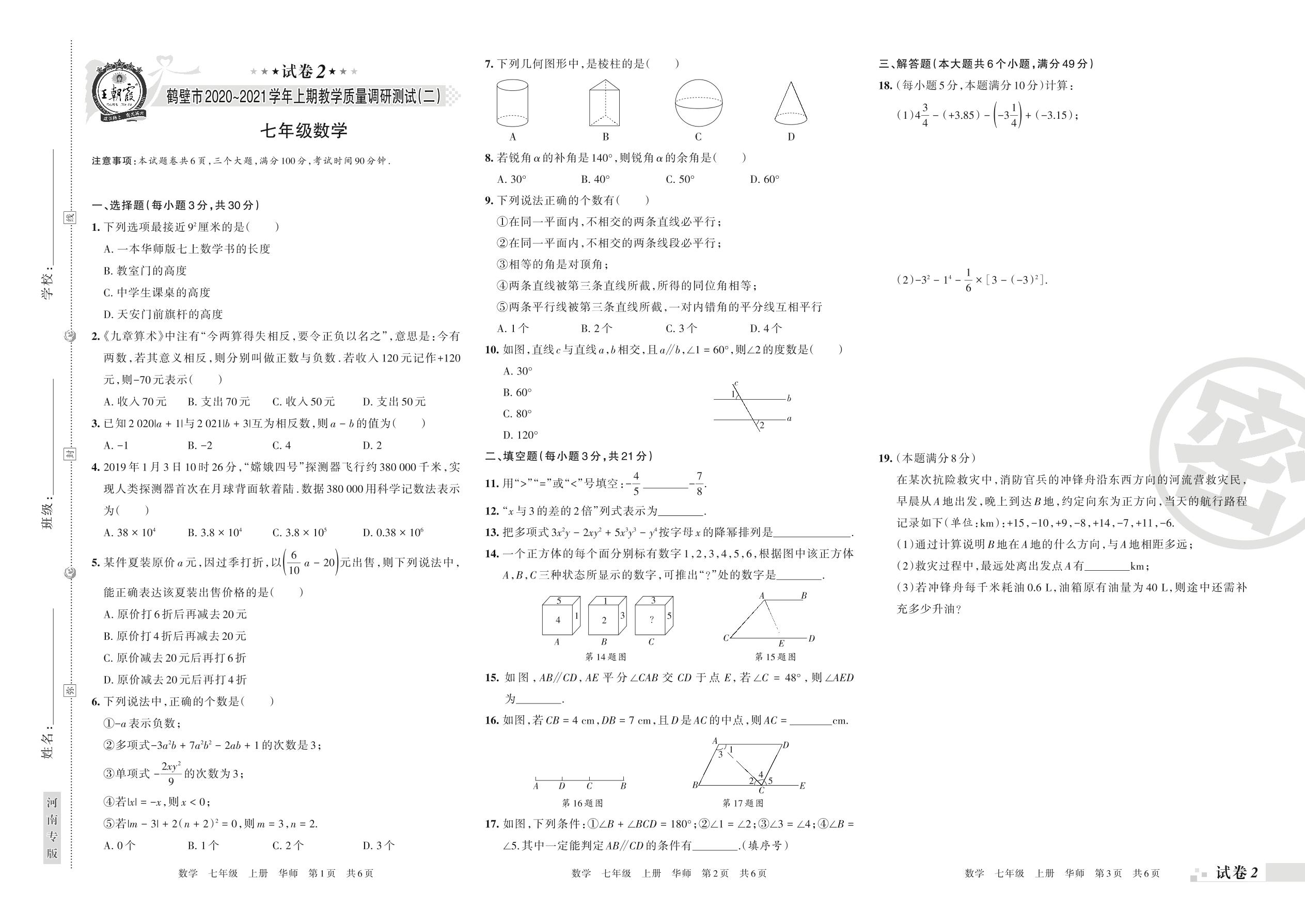 鹤壁市2020~2021学年上期教学质量调研测试(二)七年级数学(华师版)【2】