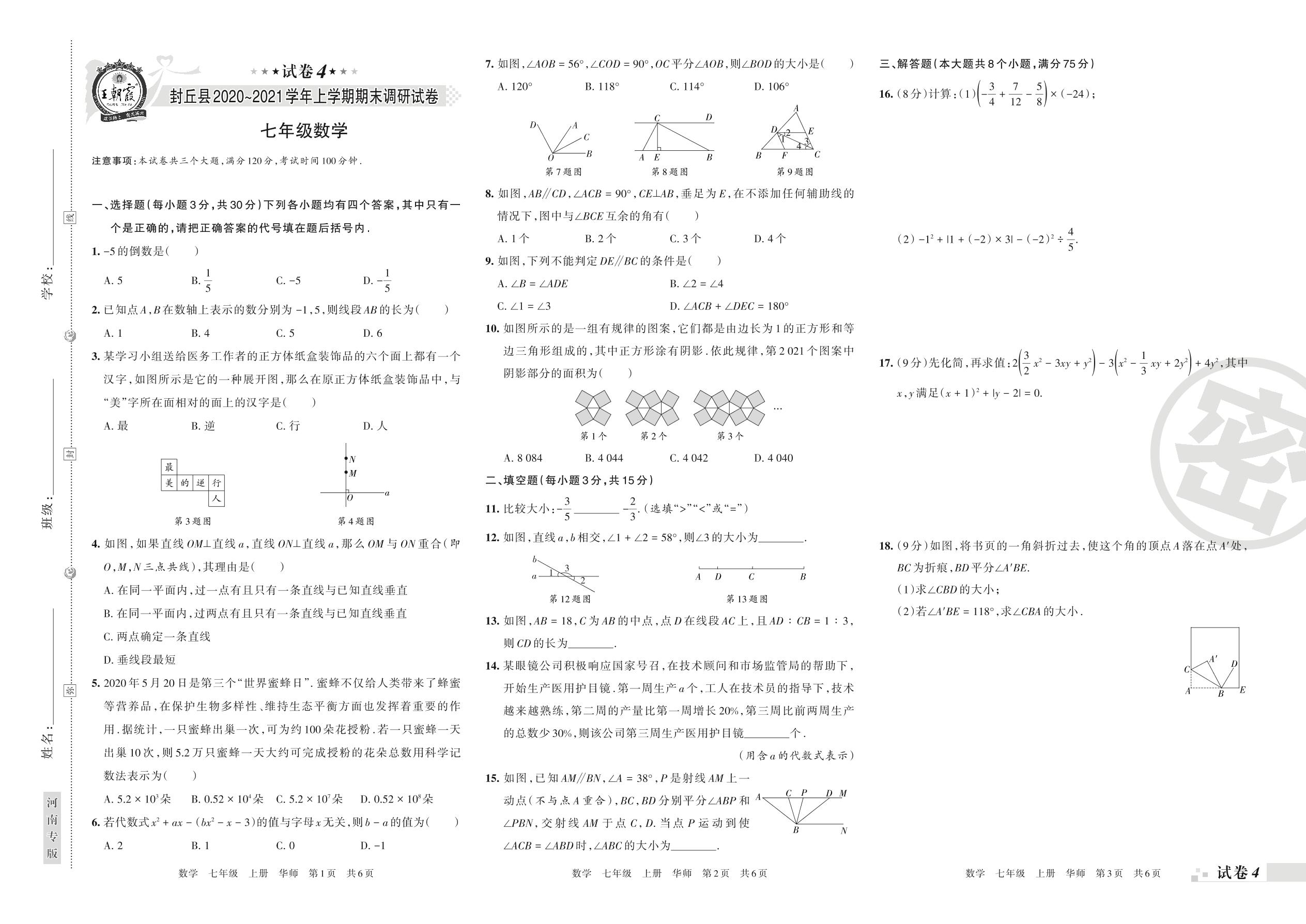 封丘县2020~2021学年上学期期末调研试卷七年级数学(华师版)【4】