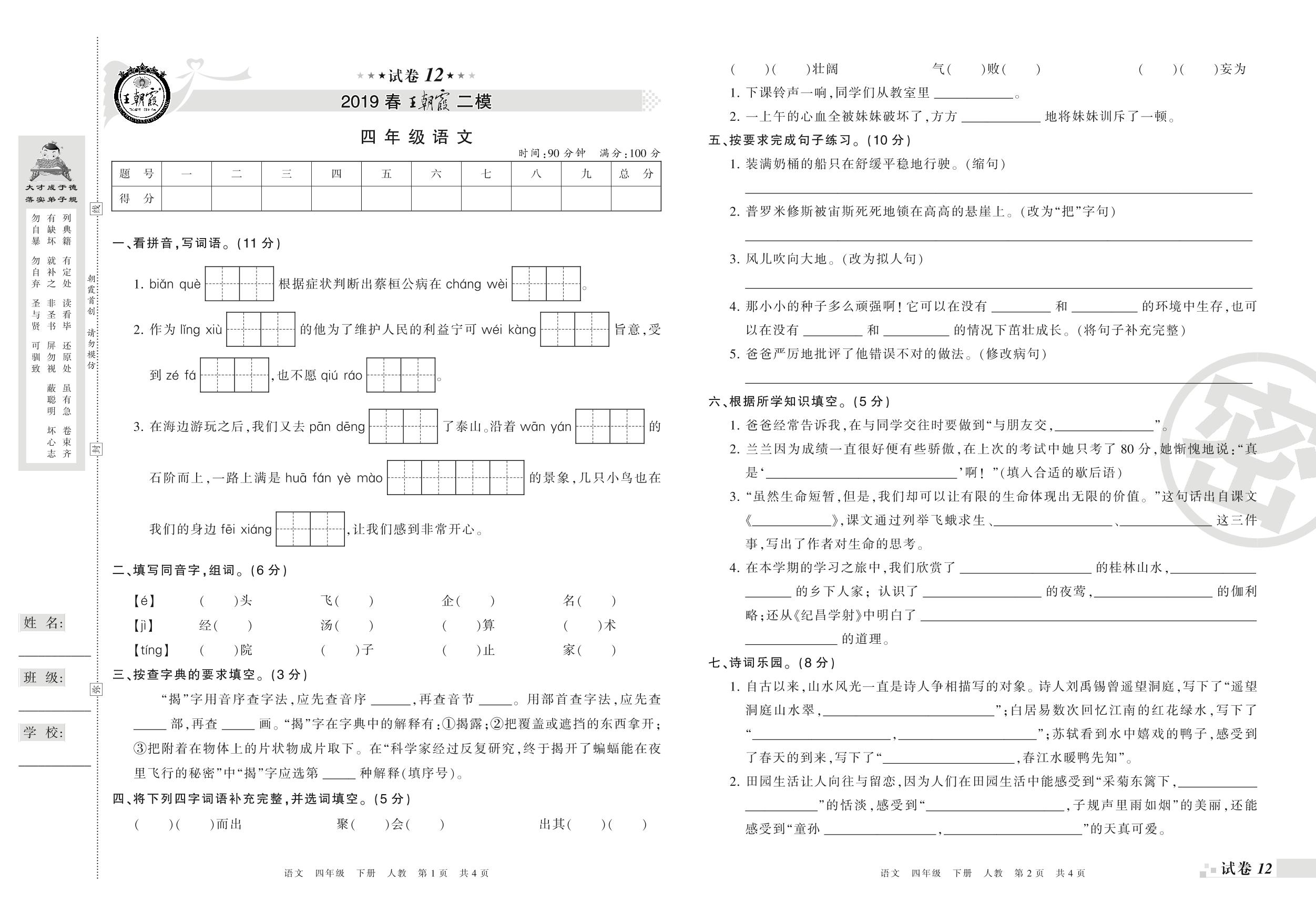 王朝霞期末模拟卷四年级下册语文(人教版)【12】