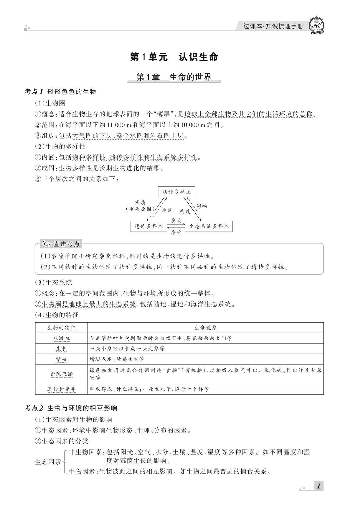 王朝霞期末过课本——知识梳理手册七年级上册生物(北师版)