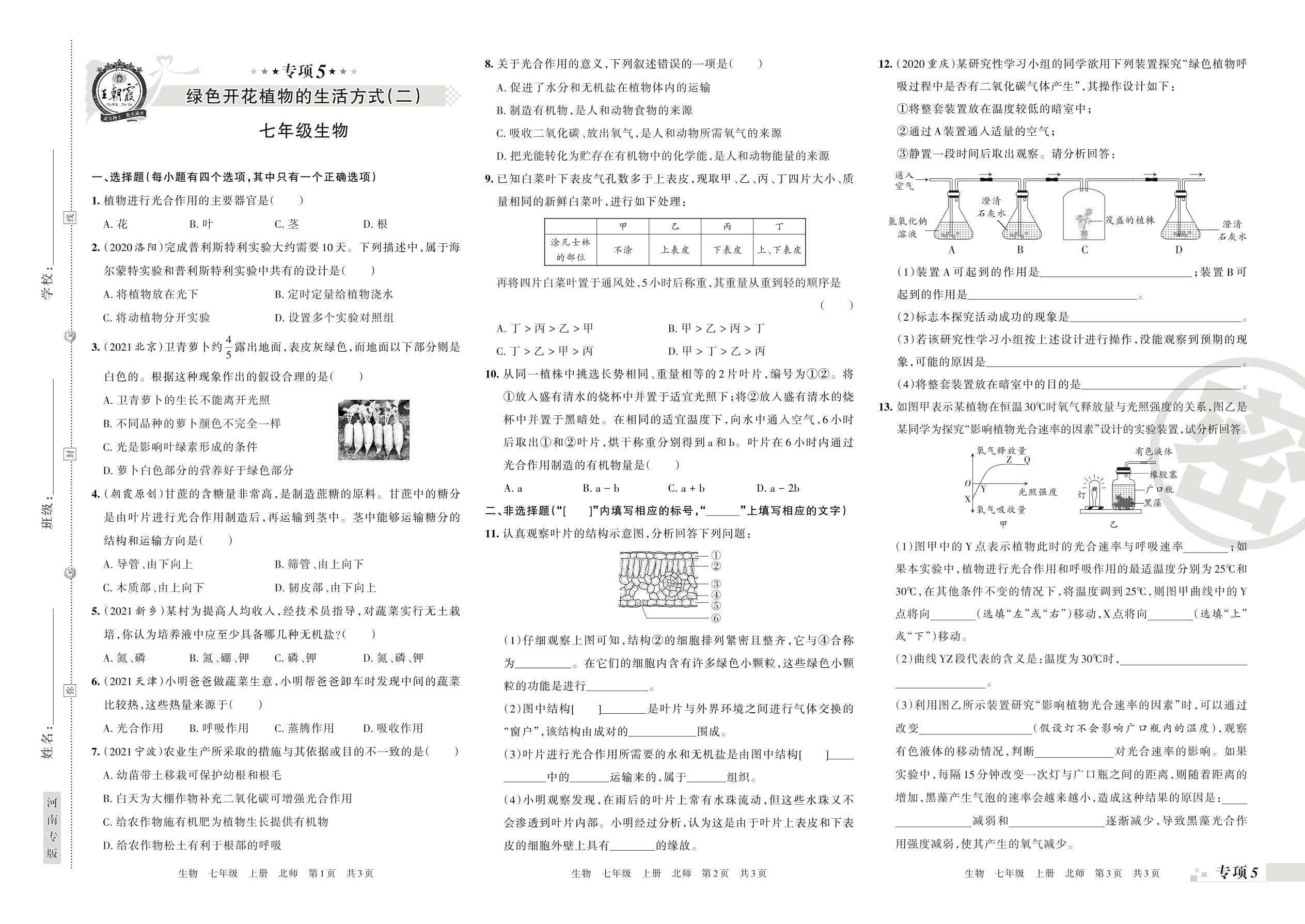 王朝霞期末专项卷——绿色开花植物的生活方式(二)七年级上册生物(北师版)【5】
