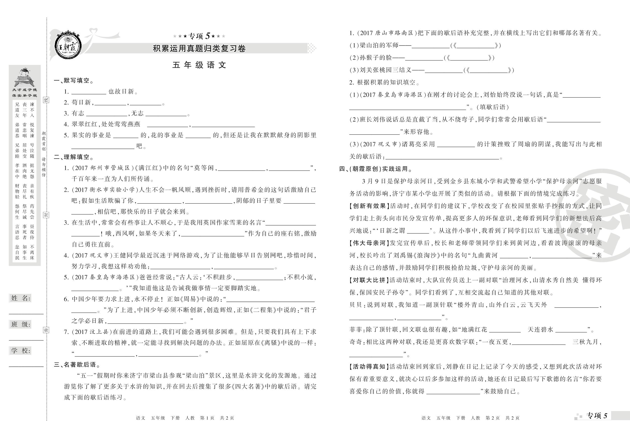 王朝霞期末专项卷——积累运用、课内阅读(一)真题归类复习卷五年级下册语文(人教版)_R210801205140【0】