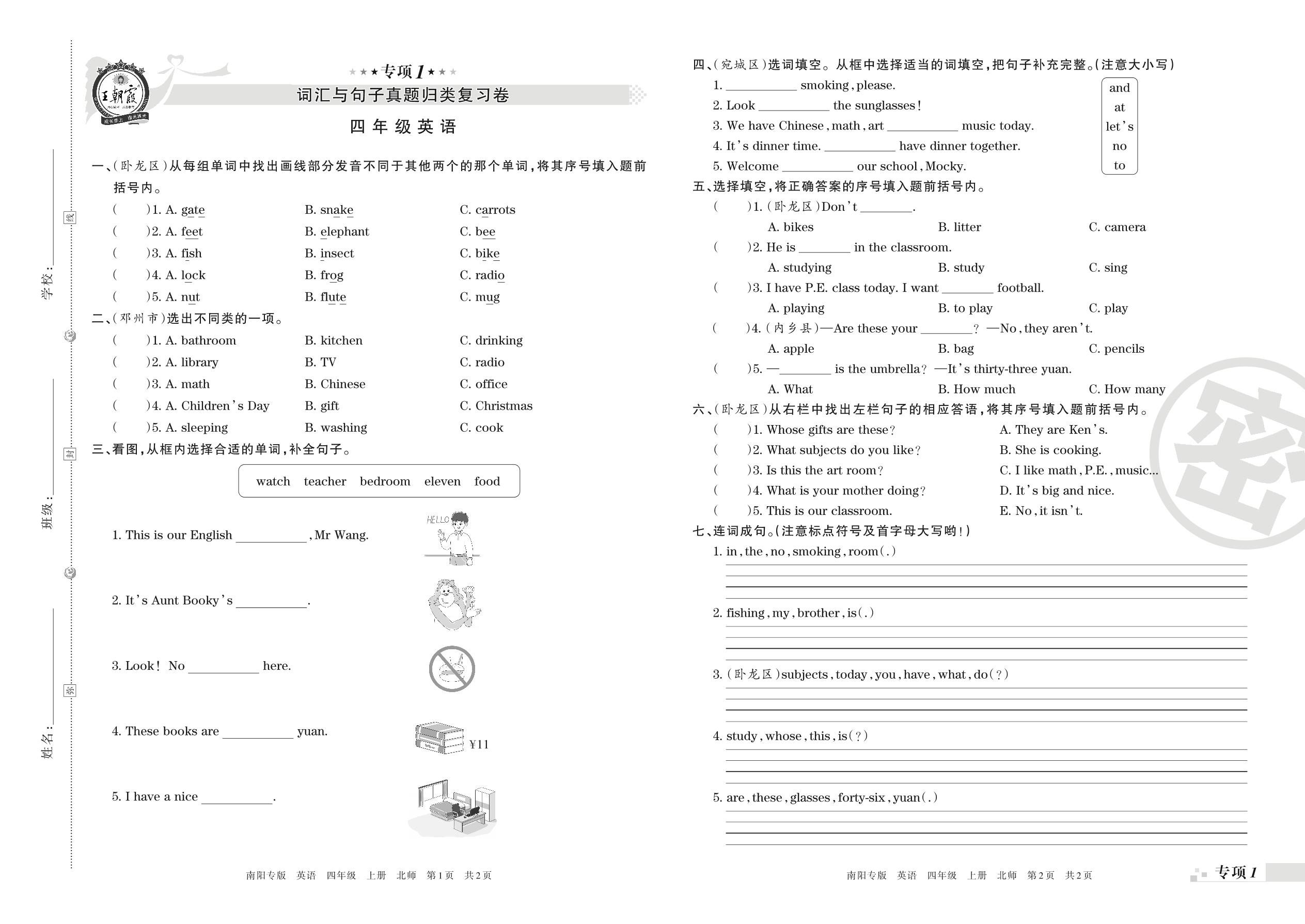 王朝霞期末专项卷——词汇与句子真题归类复习卷四年级上册英语(北师版)【1】