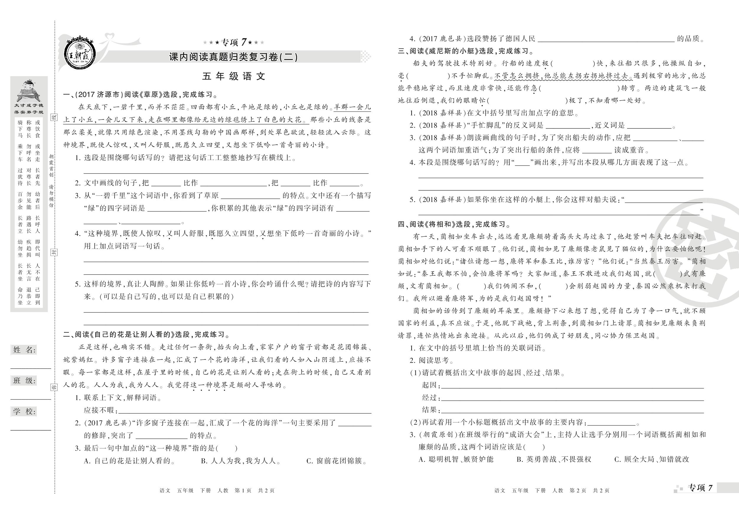 王朝霞期末专项卷——课内阅读(二)、课外阅读与写作真题归类复习卷五年级下册语文(人教版)_R210801205142【0】