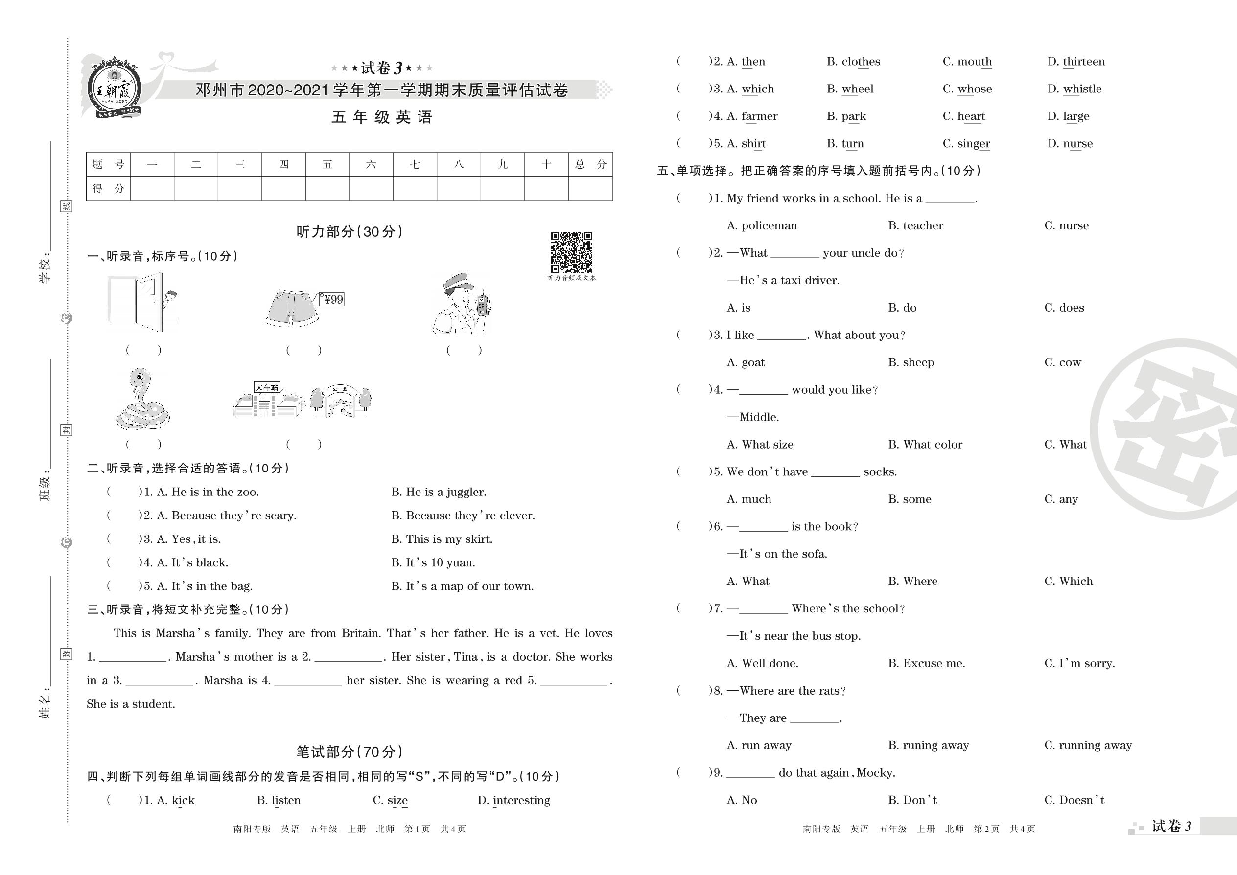邓州市2020~2021学年第一学期期末质量评估试卷五年级英语(北师版)【3】