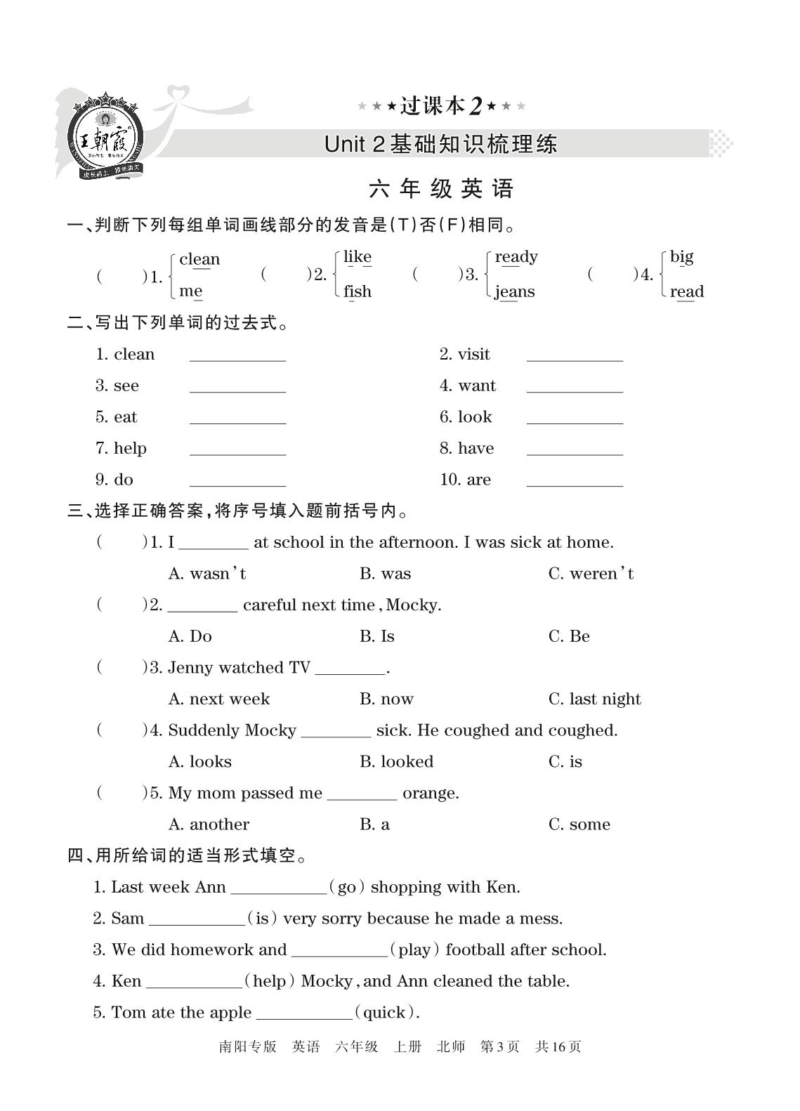 王朝霞期末过课本——Unit 2基础知识梳理练六年级上册英语(北师版)【2】