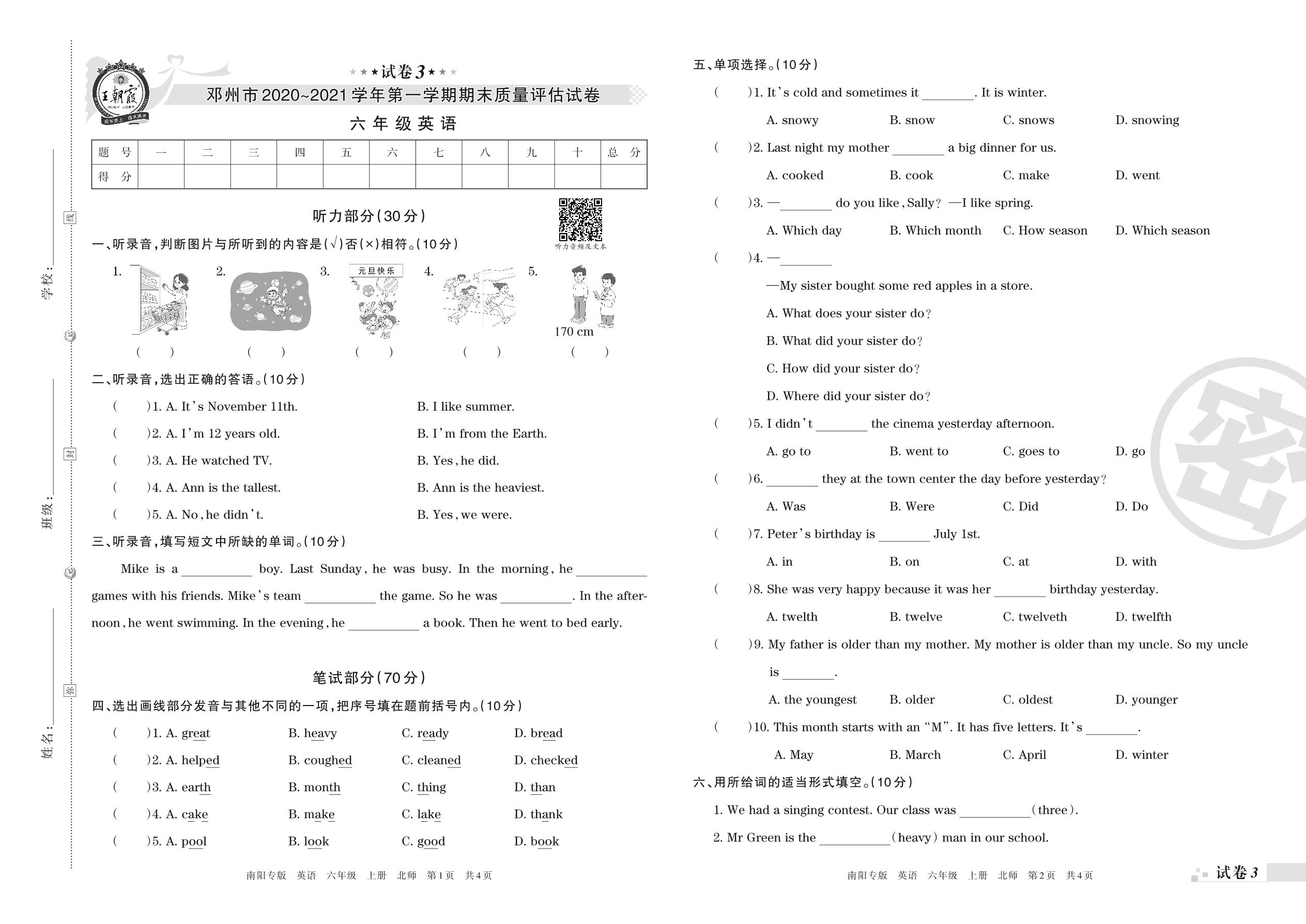 邓州市2020~2021学年第一学期期末质量评估试卷六年级英语(北师版)【3】