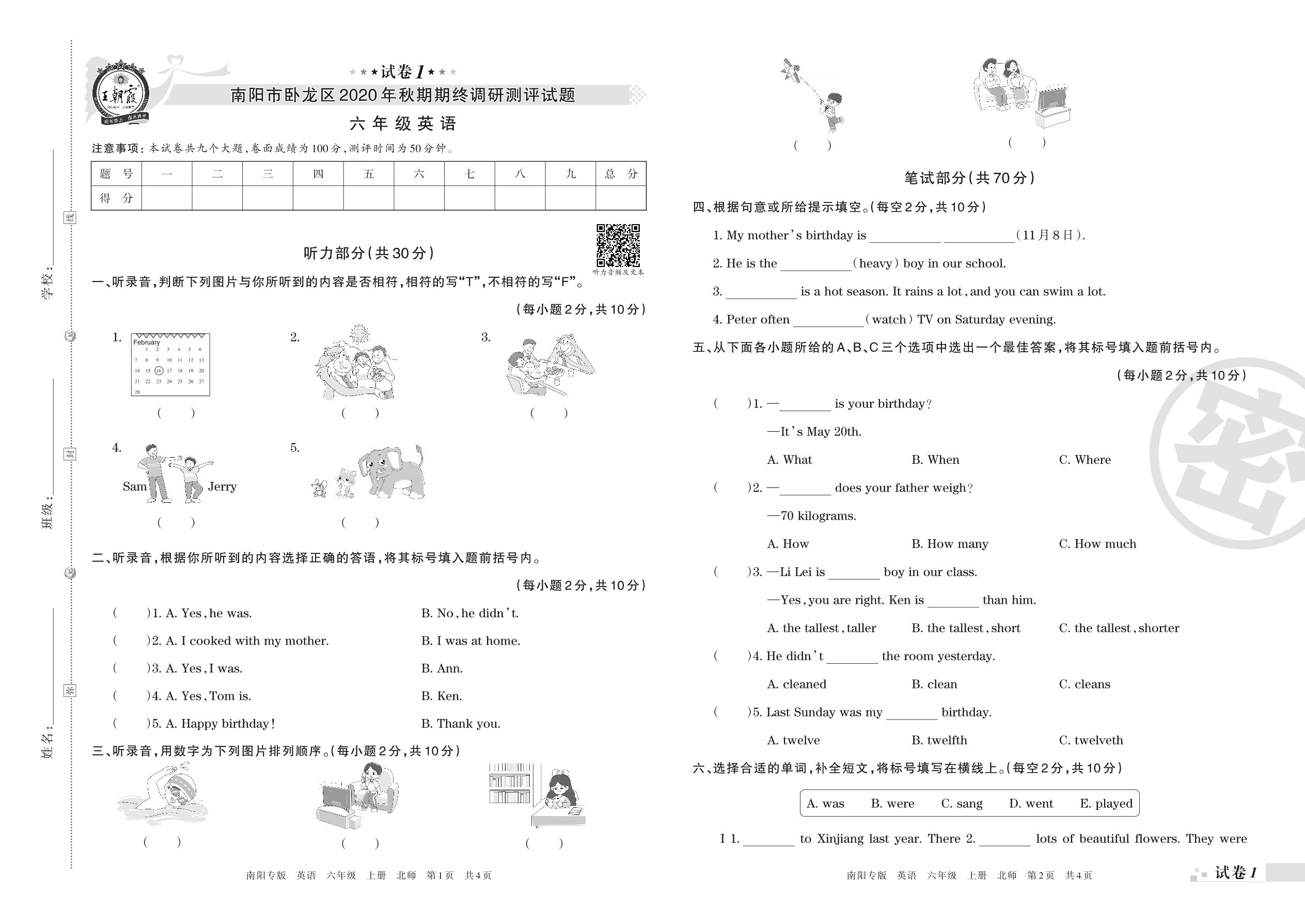 南阳市卧龙区2020年秋期期终调研测评试题六年级英语(北师版)【1】
