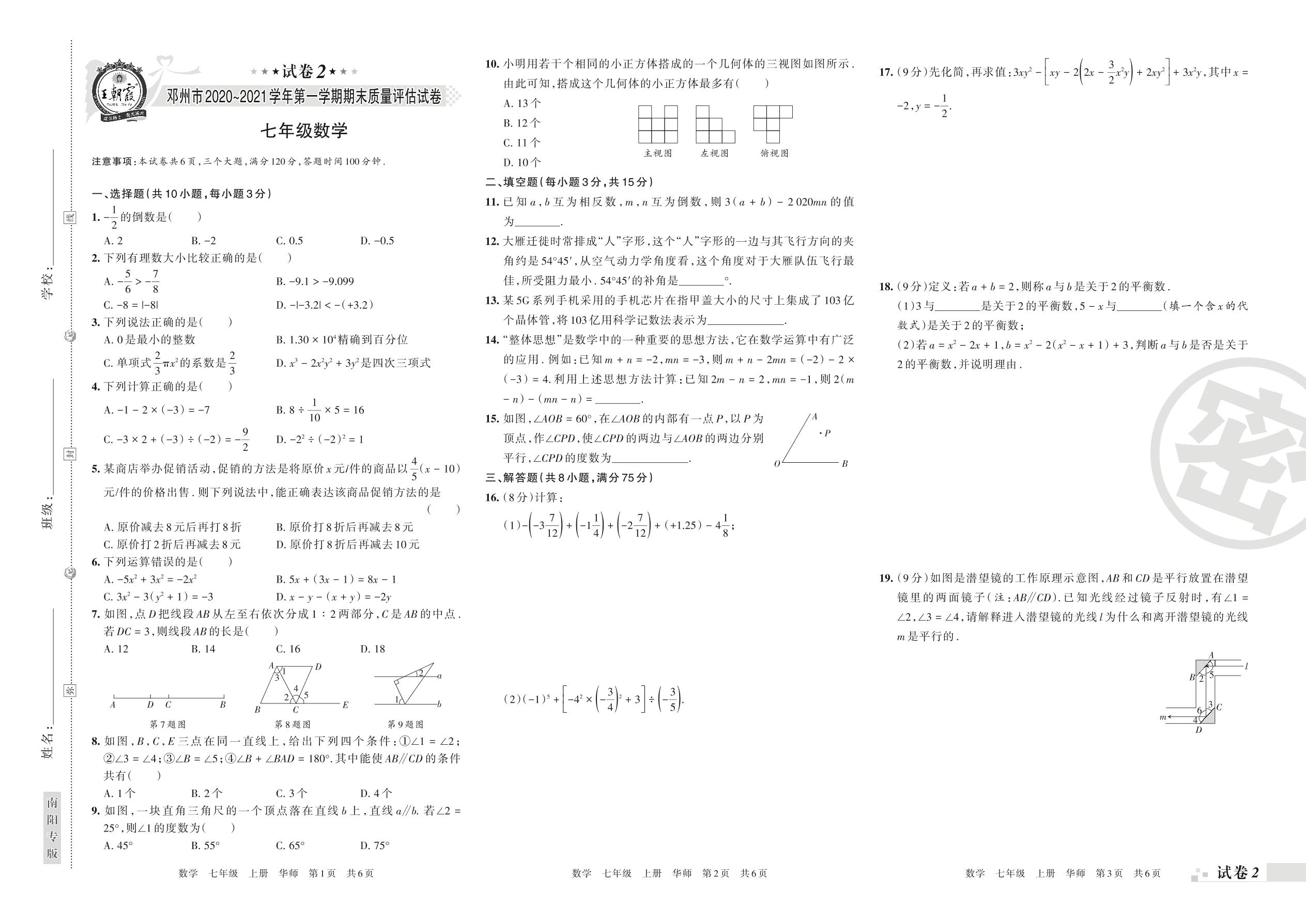 邓州市2020~2021学年第一学期期末质量评估试卷七年级数学(华师版)【2】