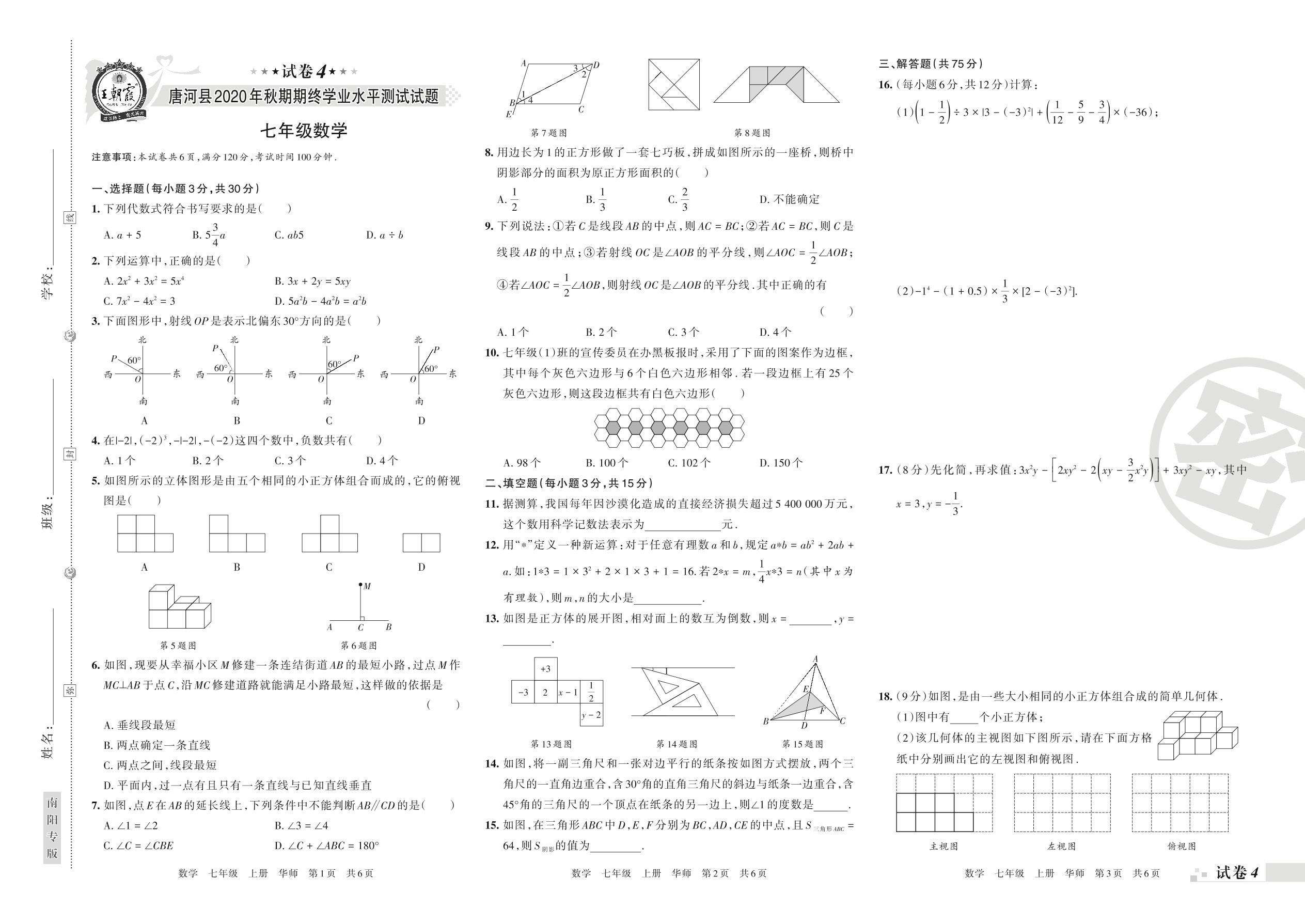 唐河县2020年秋期期终学业水平测试试题七年级数学(华师版)【4】