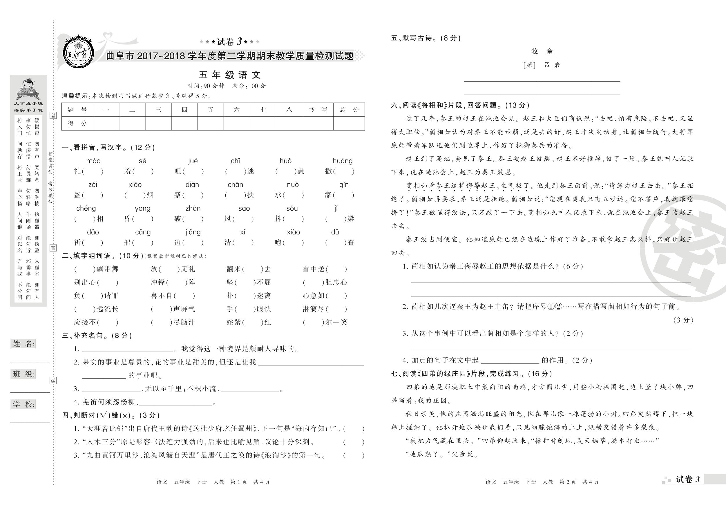 2017-2018学年第二学期曲阜市五年级语文试卷(人教版)【3】