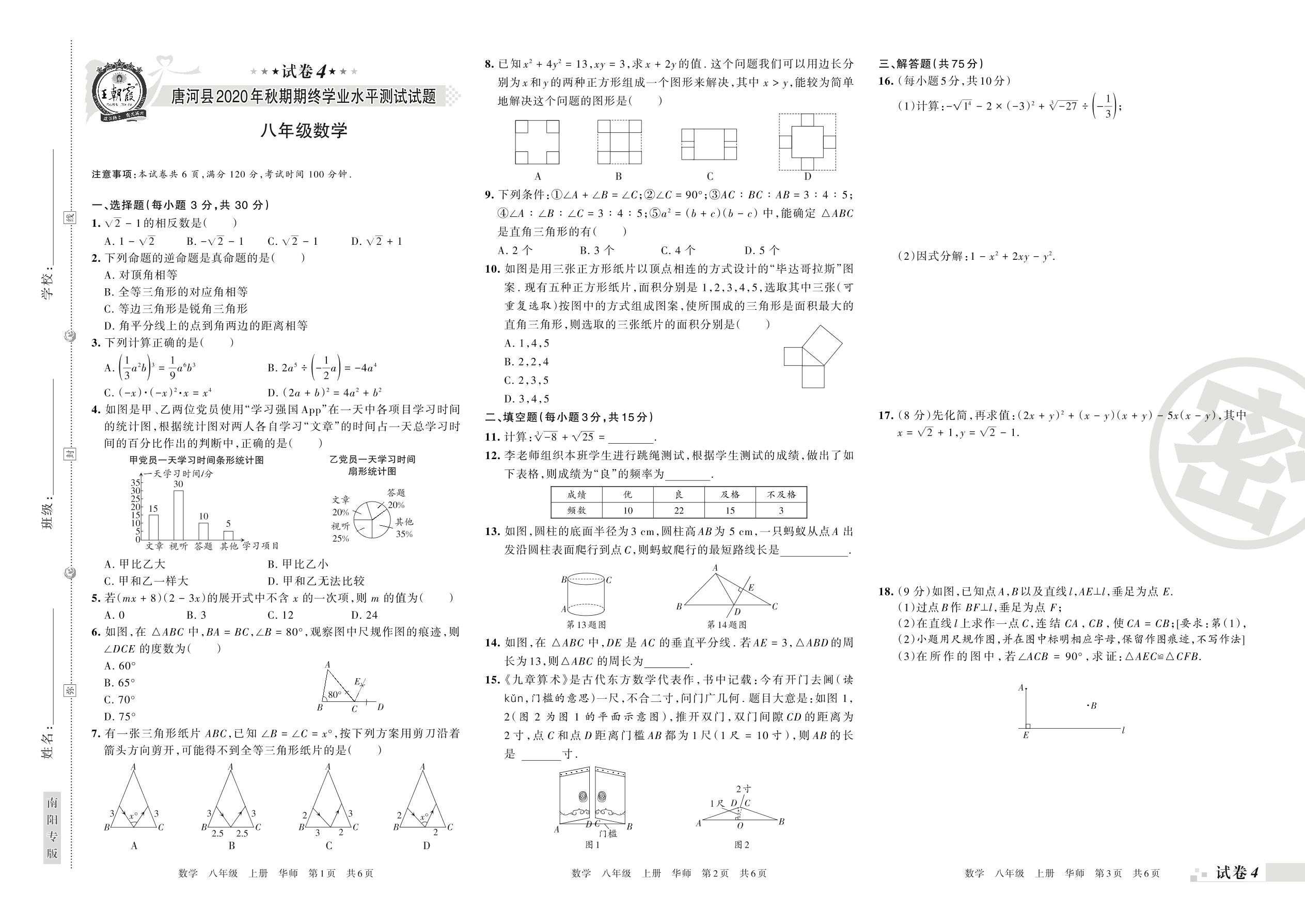 唐河县2020年秋期期终学业水平测试试题八年级数学(华师版)【4】