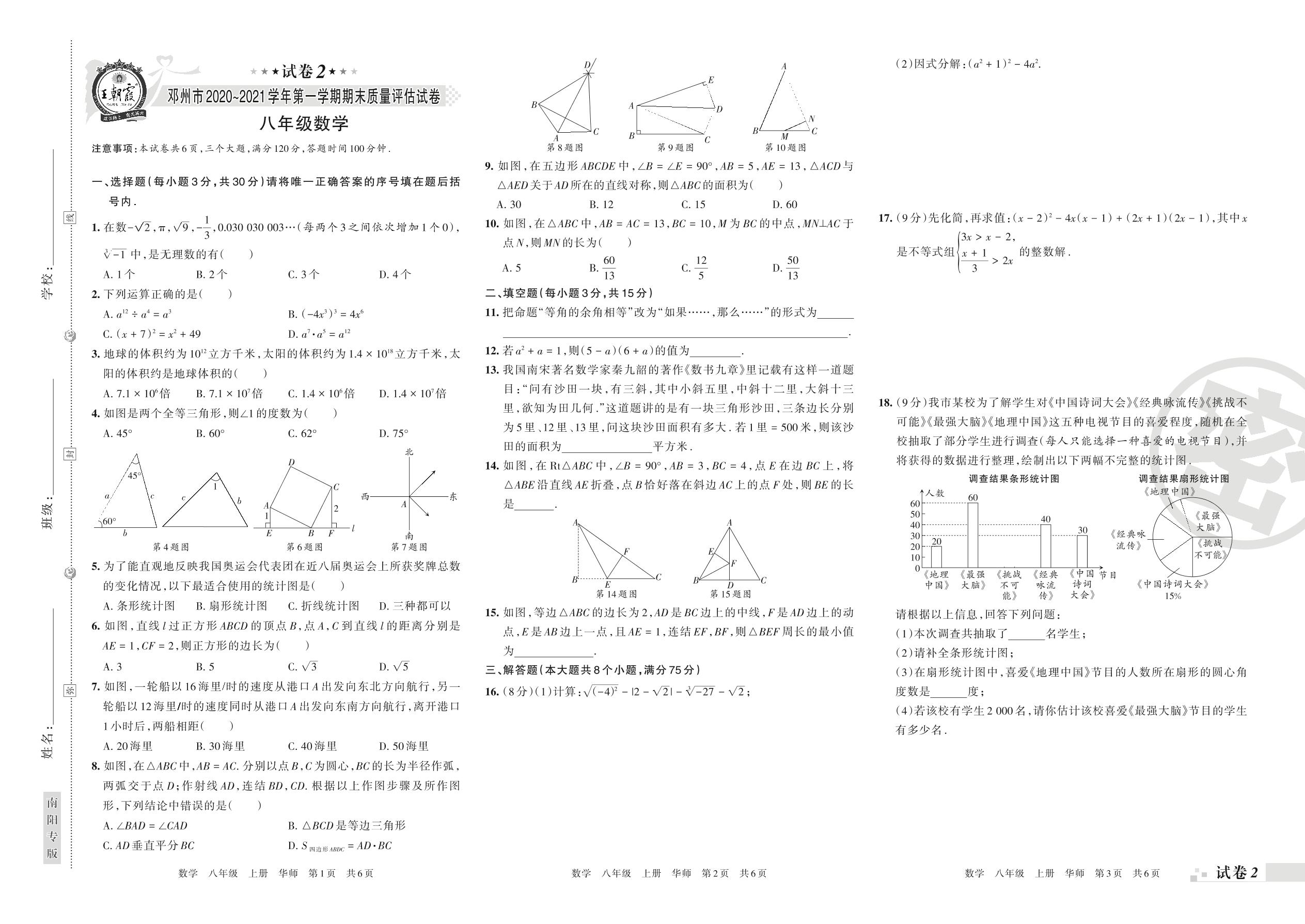 邓州市2020~2021学年第一学期期末质量评估试卷八年级数学(华师版)【2】