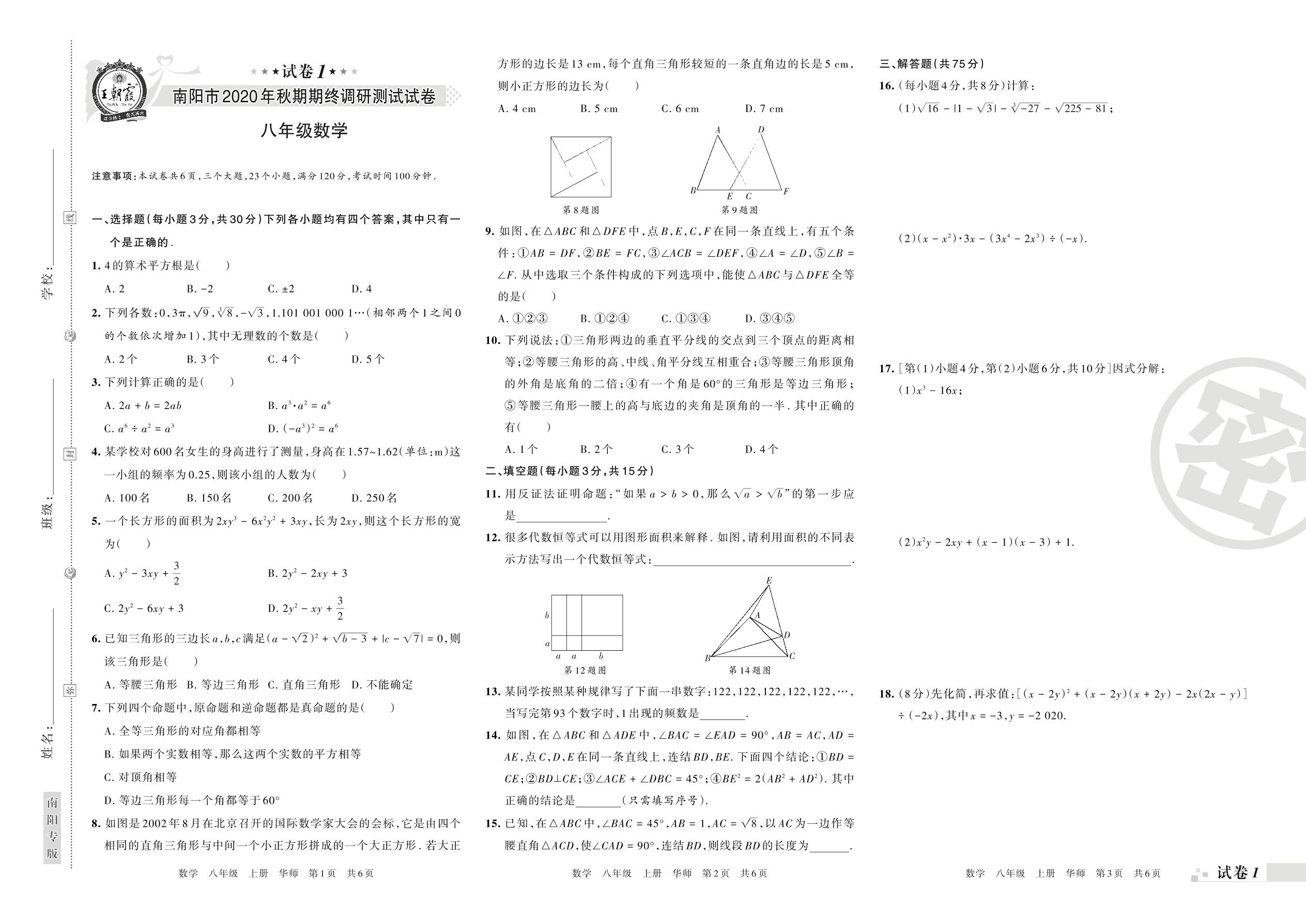南阳市2020年秋期期终调研测试试卷八年级数学(华师版)【1】