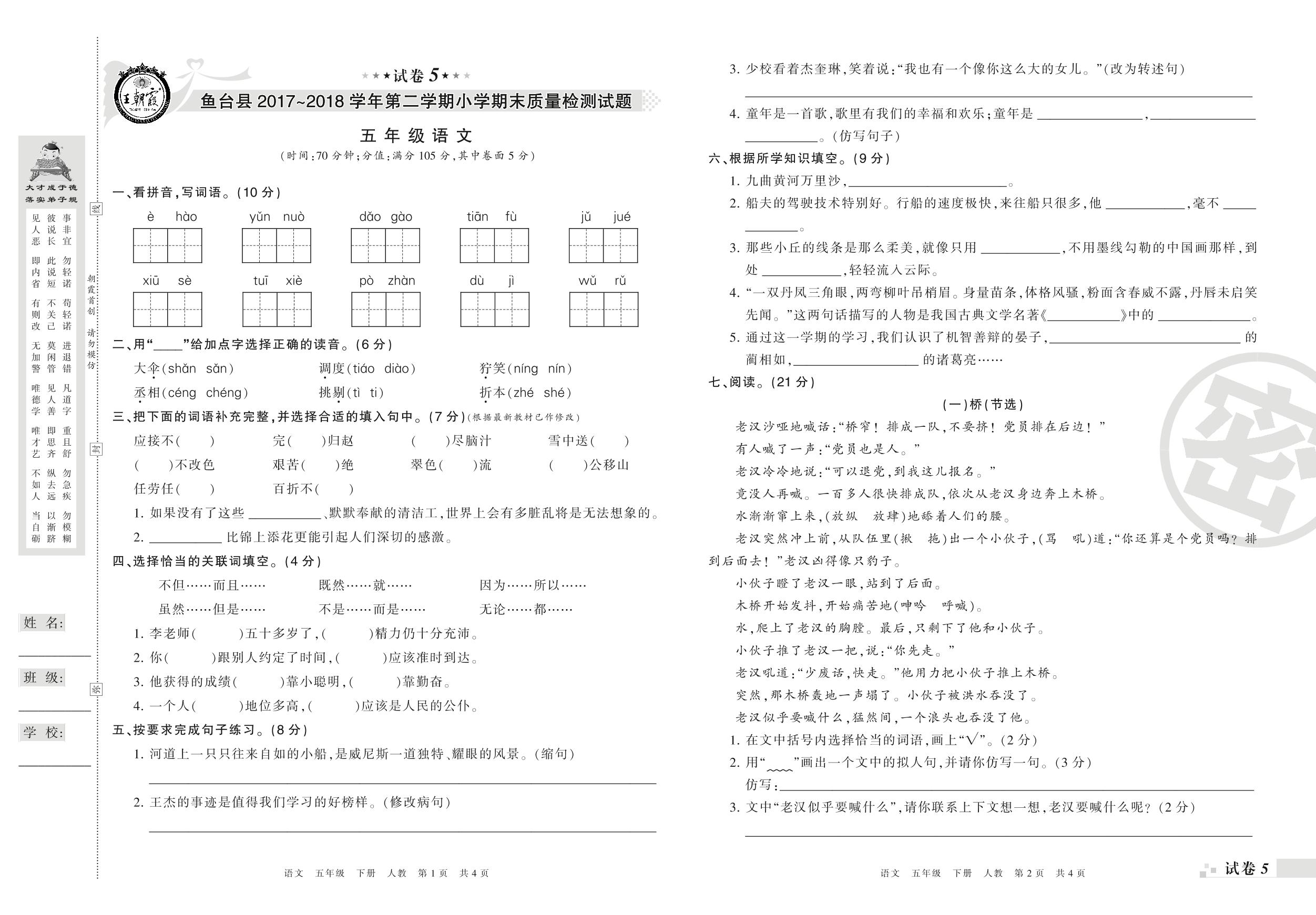 2017-2018学年第二学期济宁市鱼台县五年级语文试卷(人教版)【5】