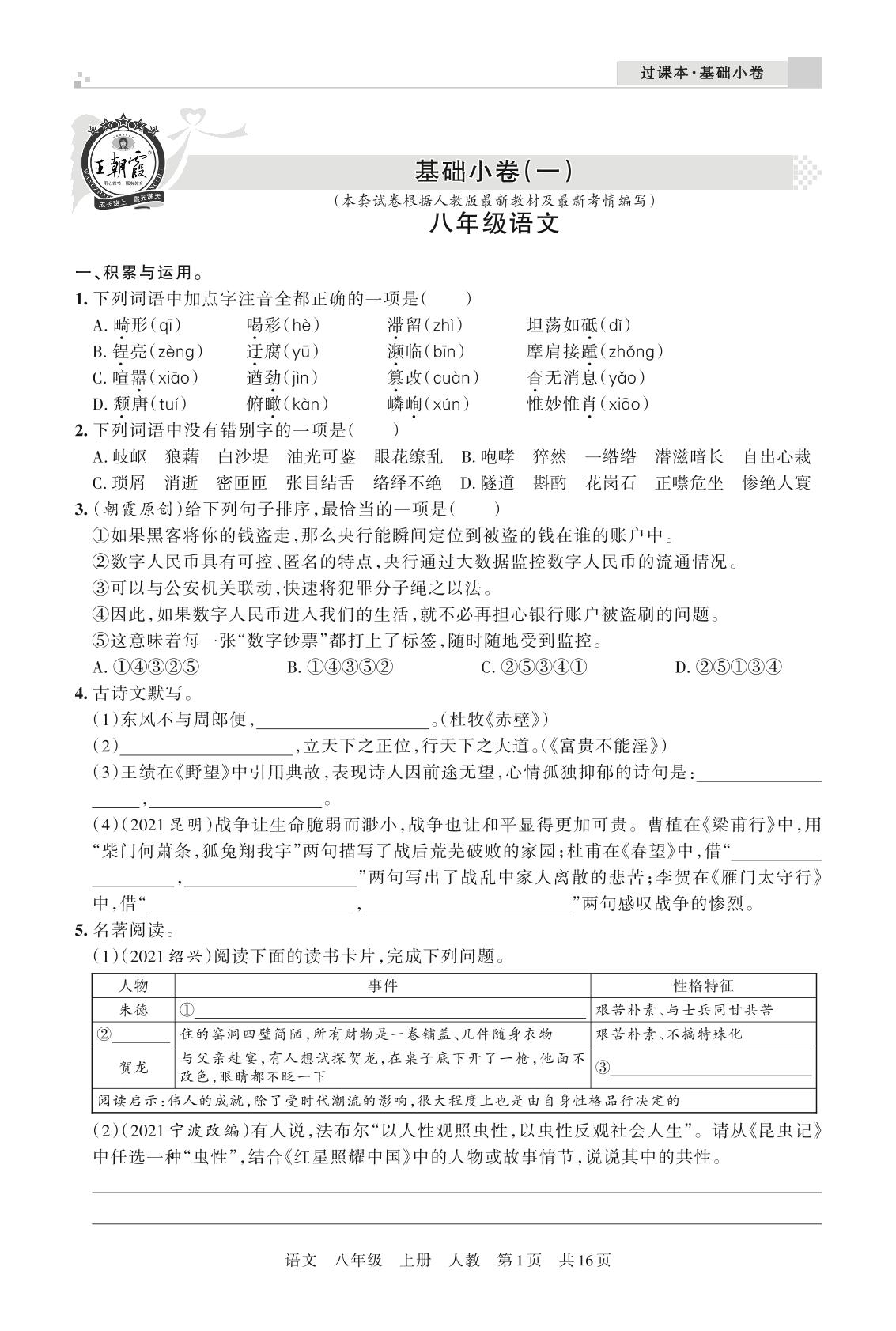 王朝霞期末过课本——基础小卷(一)八年级上册语文(人教版)【7】