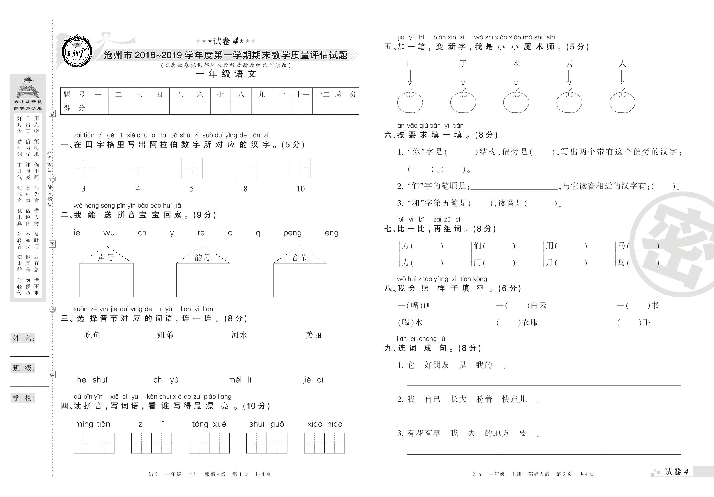 2018-2019学年第一学期沧州市一年级语文试卷(人教版)【4】