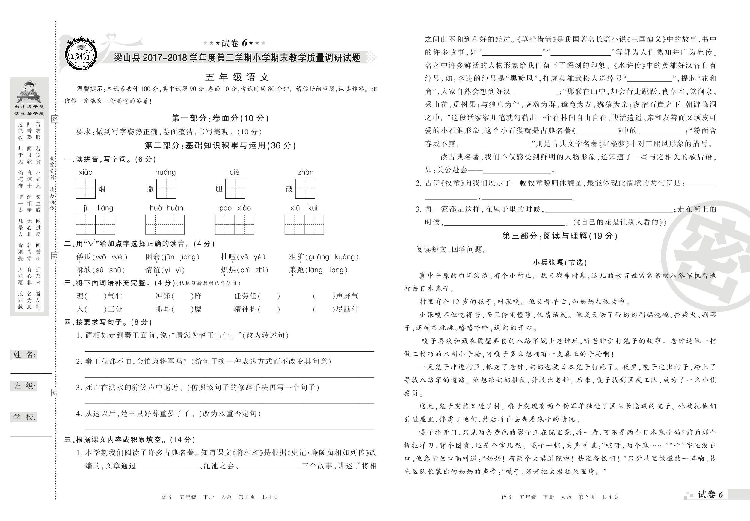 2017-2018学年第二学期济宁市梁山县五年级语文试卷(人教版)【6】