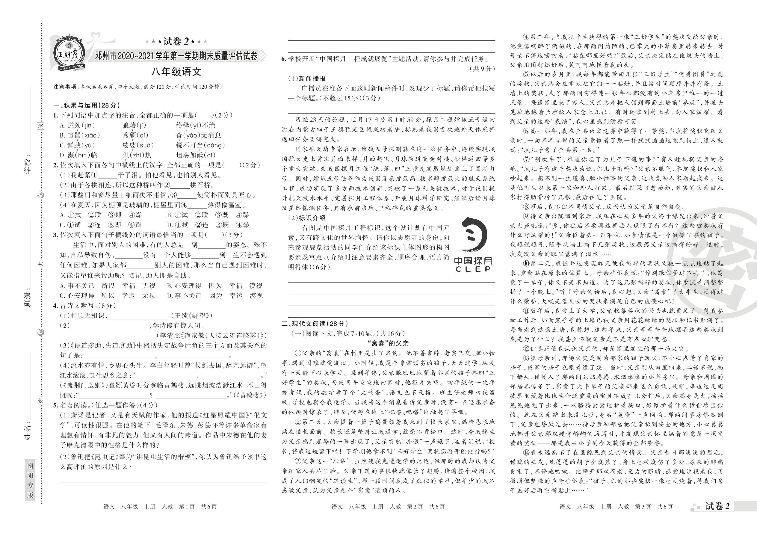 邓州市2020~2021学年第一学期期末质量评估试卷八年级语文(人教版)【2】