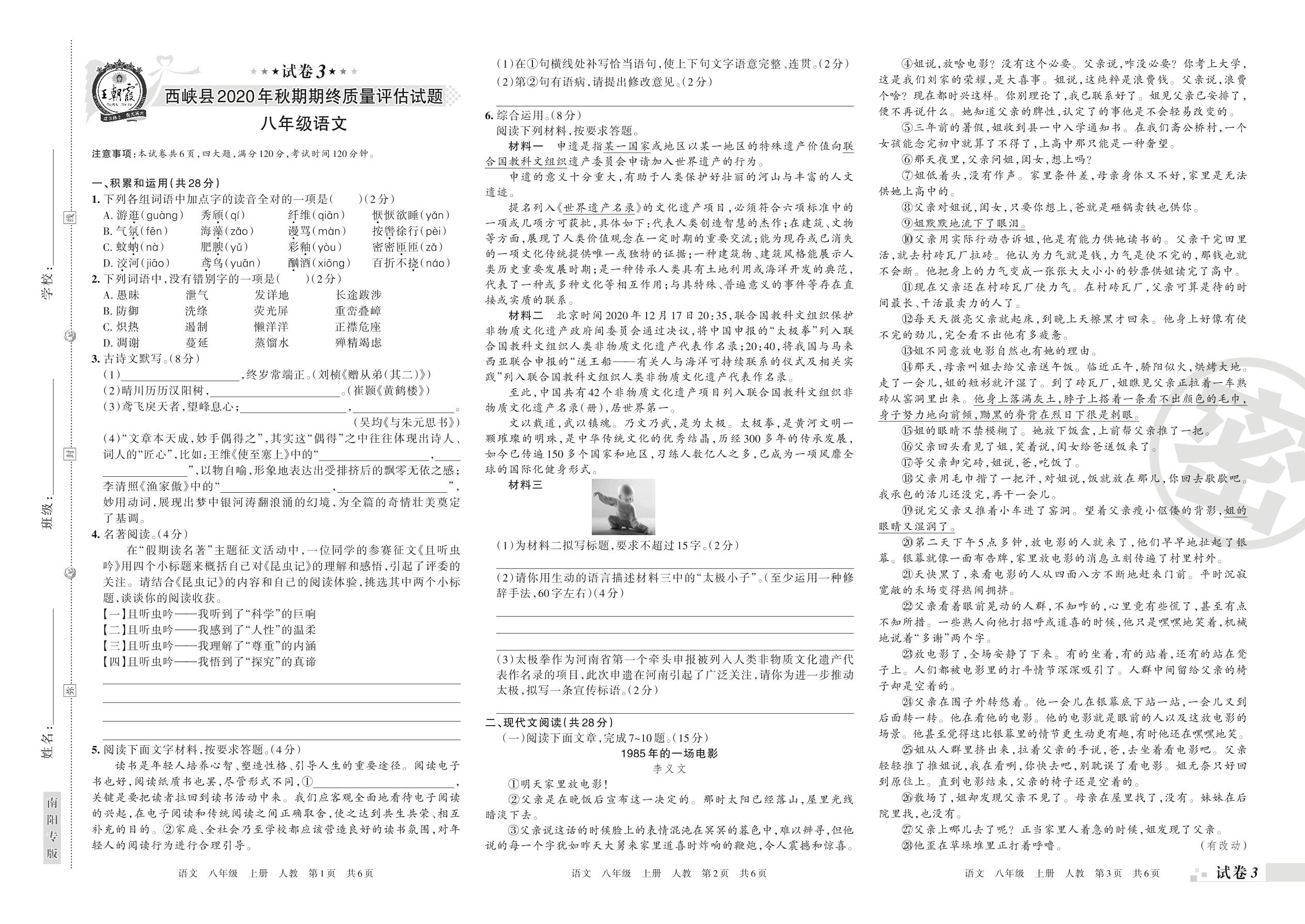 西峡县2020年秋期期终质量评估试题八年级语文(人教版)【3】
