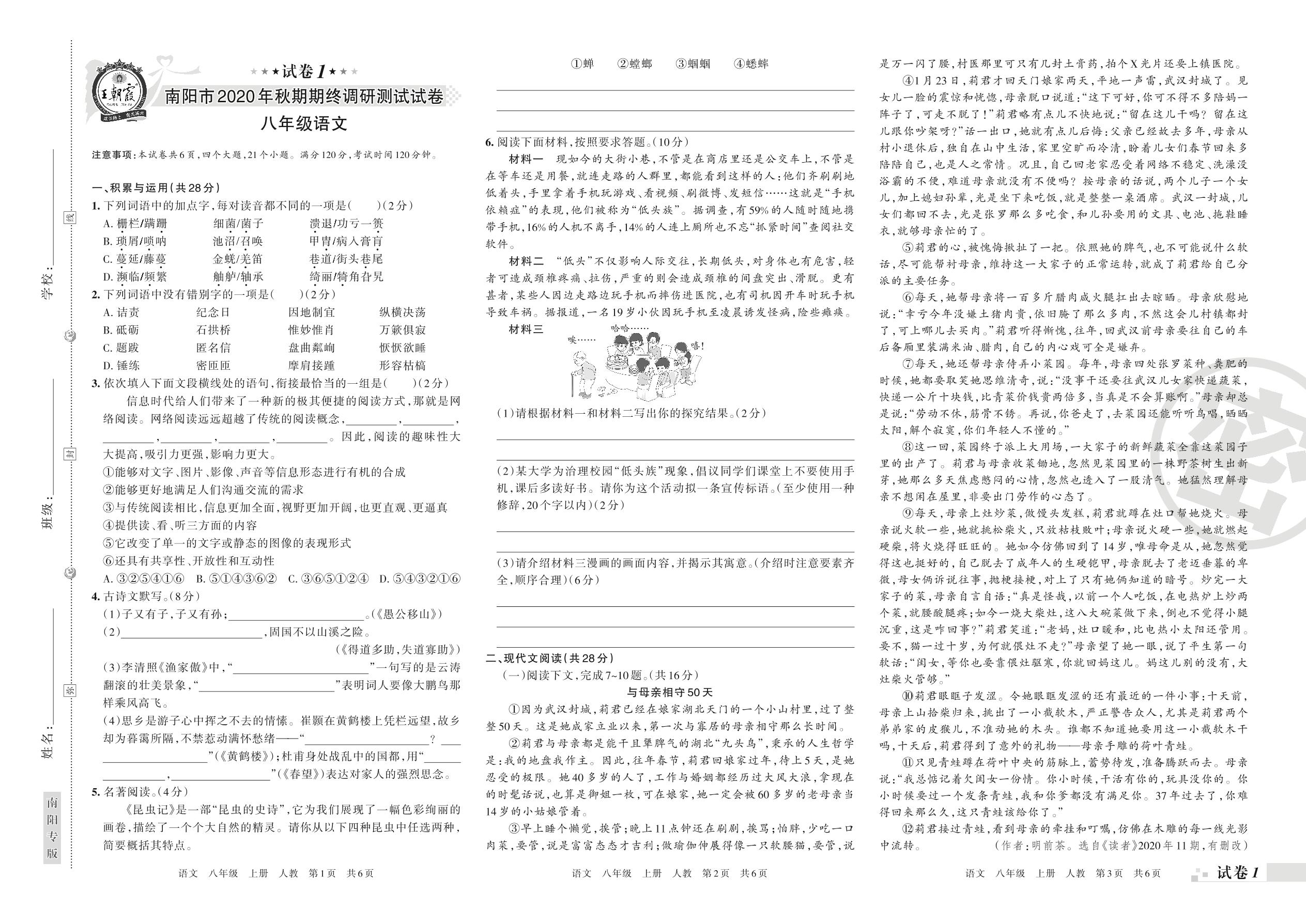 南阳市2020年秋期期终调研测试试卷八年级语文(人教版)【1】
