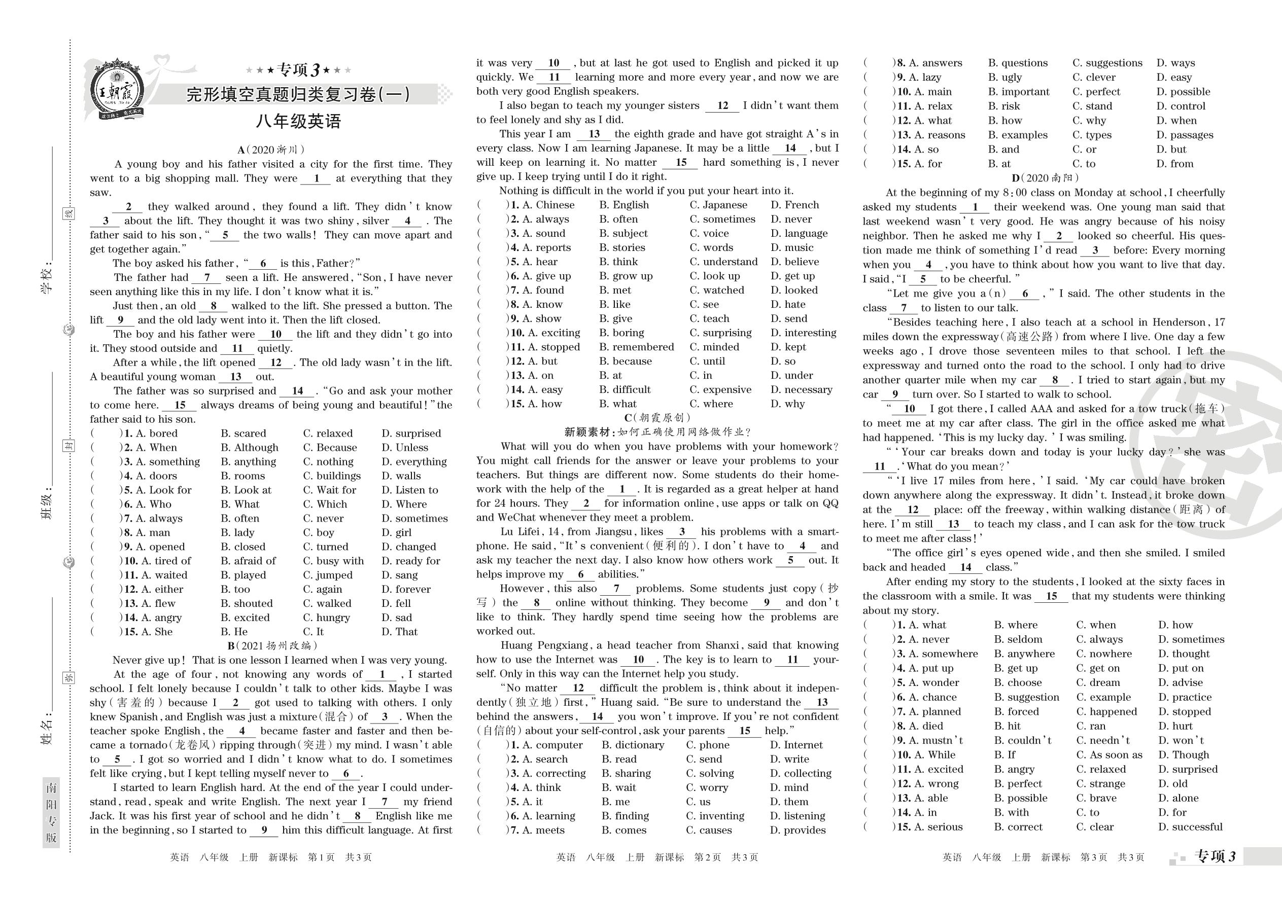 王朝霞期末专项卷——完形填空真题归类复习卷(一)八年级上册英语(新课标版)【3】