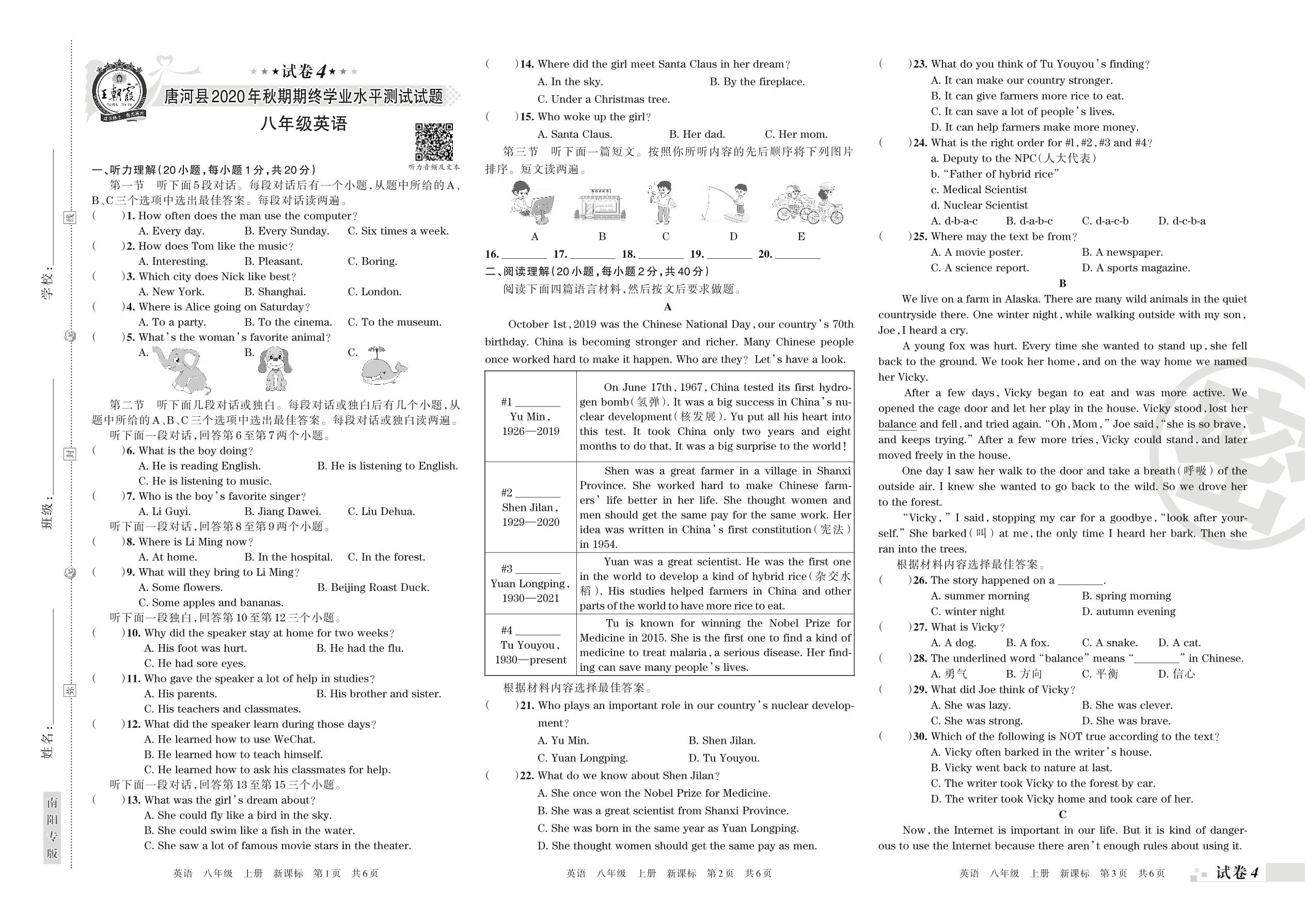 唐河县2020年秋期期终学业水平测试试题八年级英语(新课标版)【4】