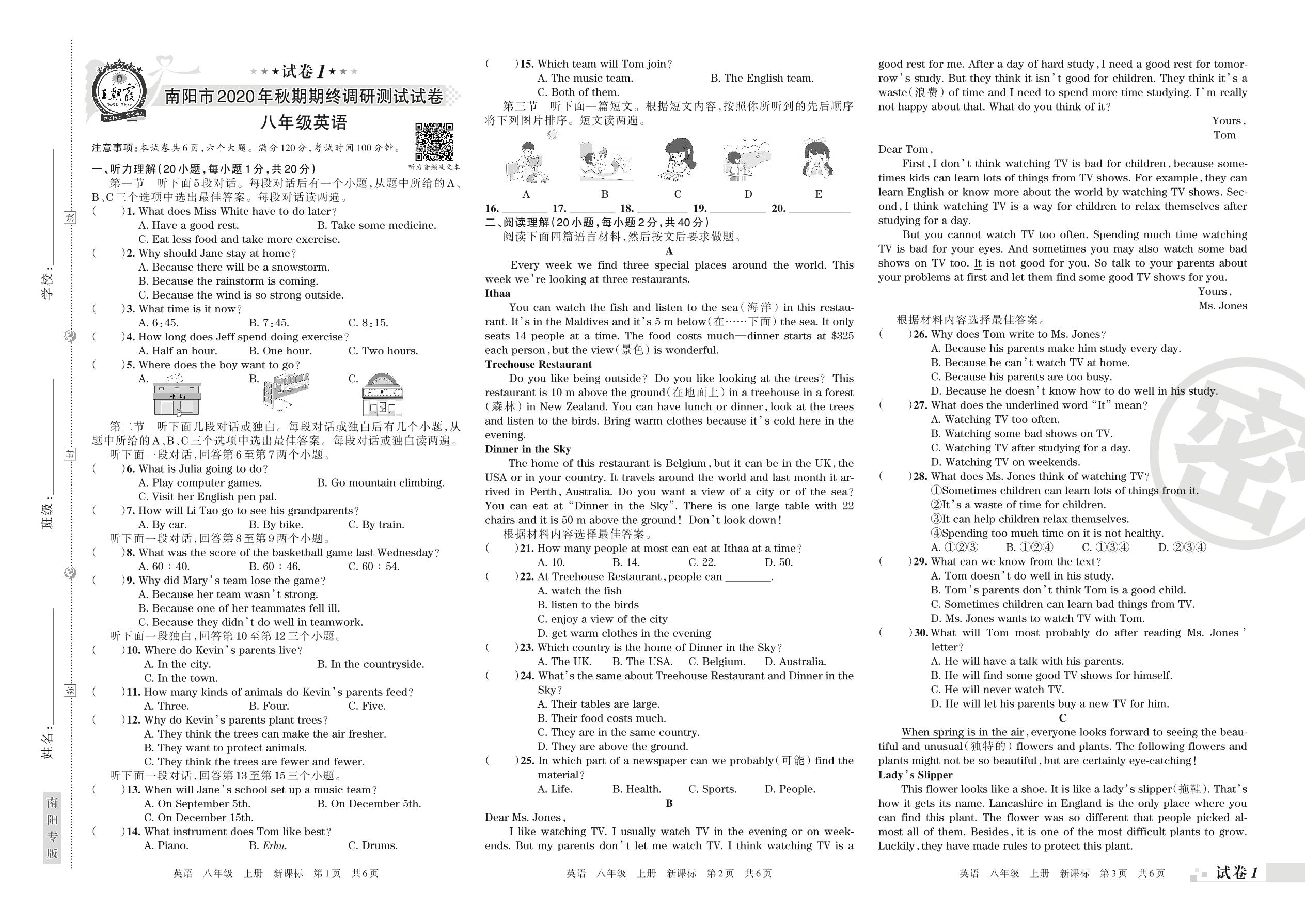 南阳市2020年秋期期终调研测试试卷八年级英语(新课标版)【1】