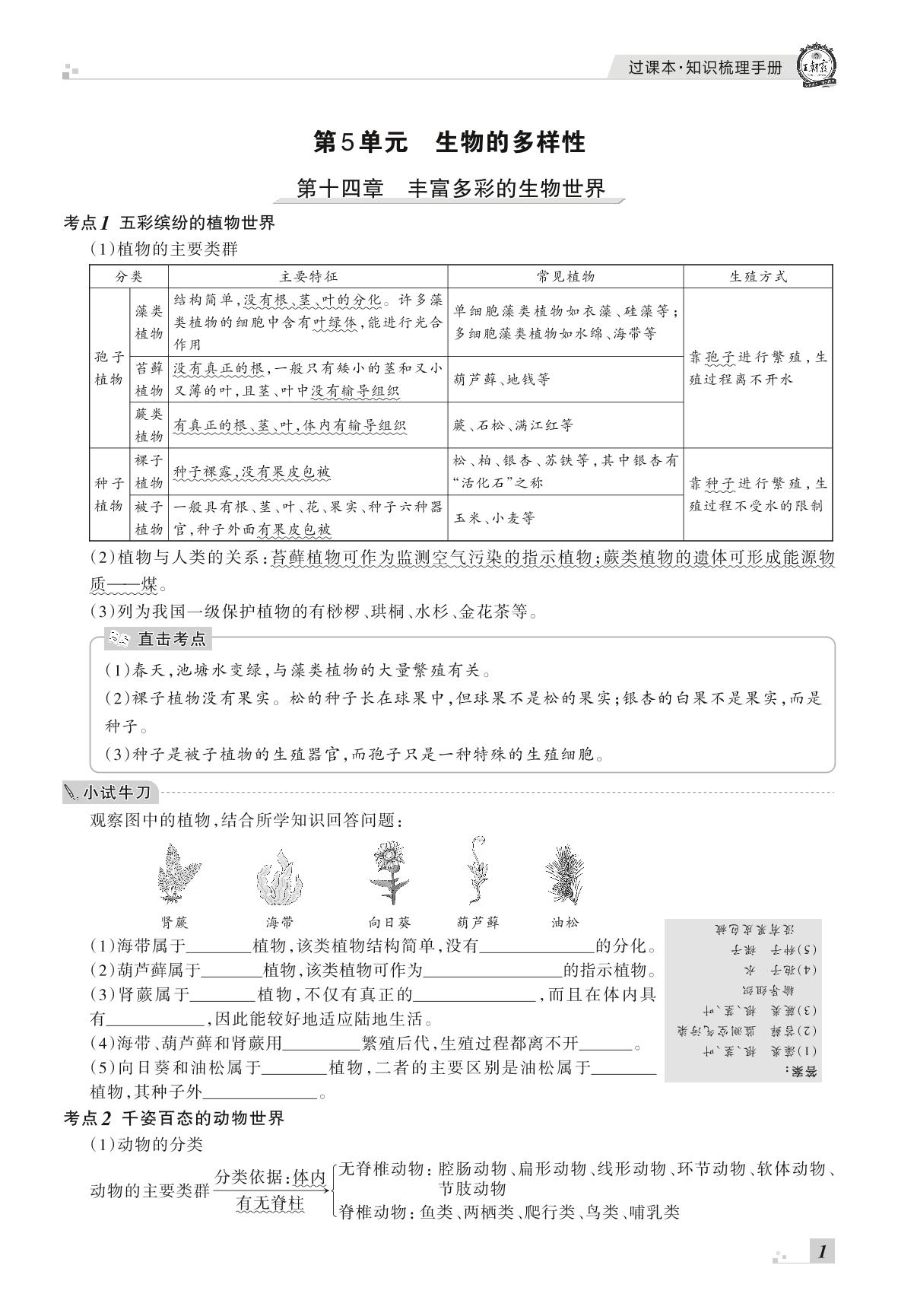 王朝霞期末过课本——知识梳理手册八年级上册生物(新课标版)