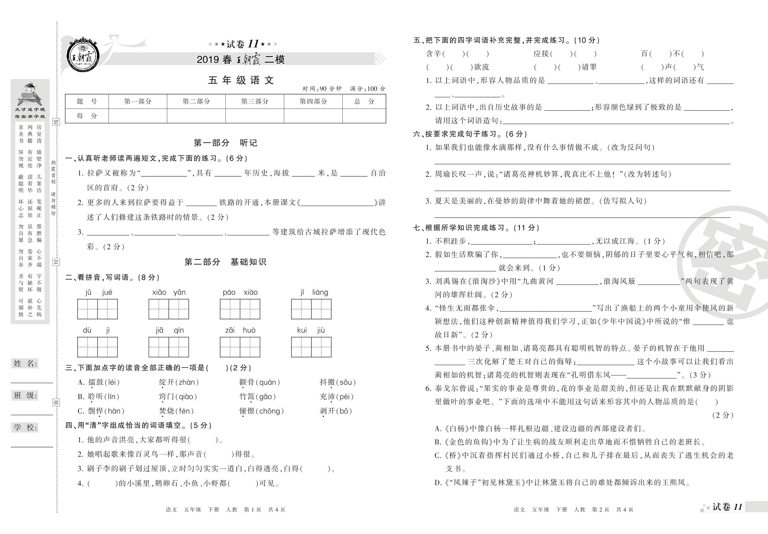 王朝霞期末模拟卷五年级下册语文(人教版)_R210801205205【11】