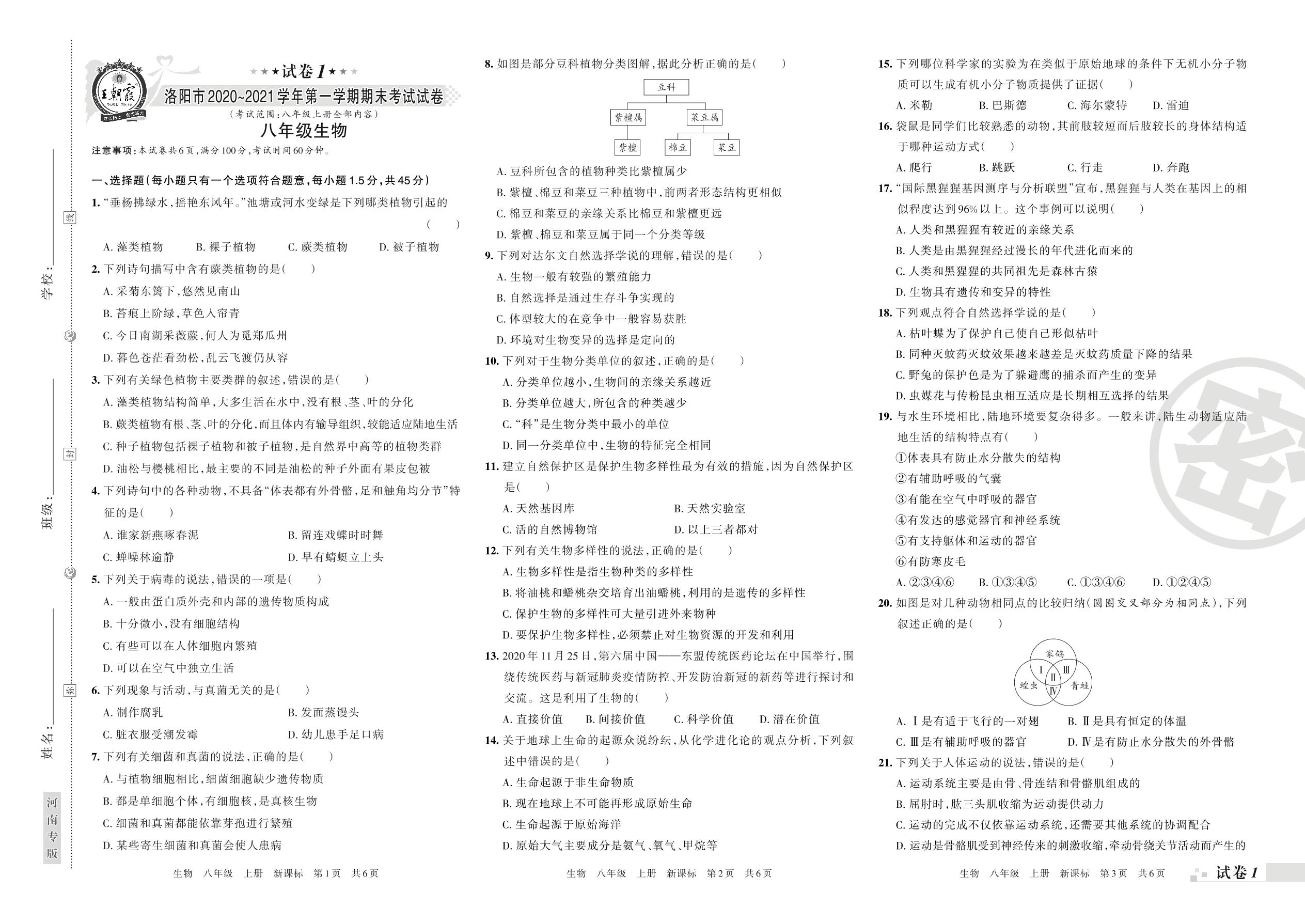 洛阳市2020~2021学年第一学期期末考试试卷八年级生物(新课标版)【1】