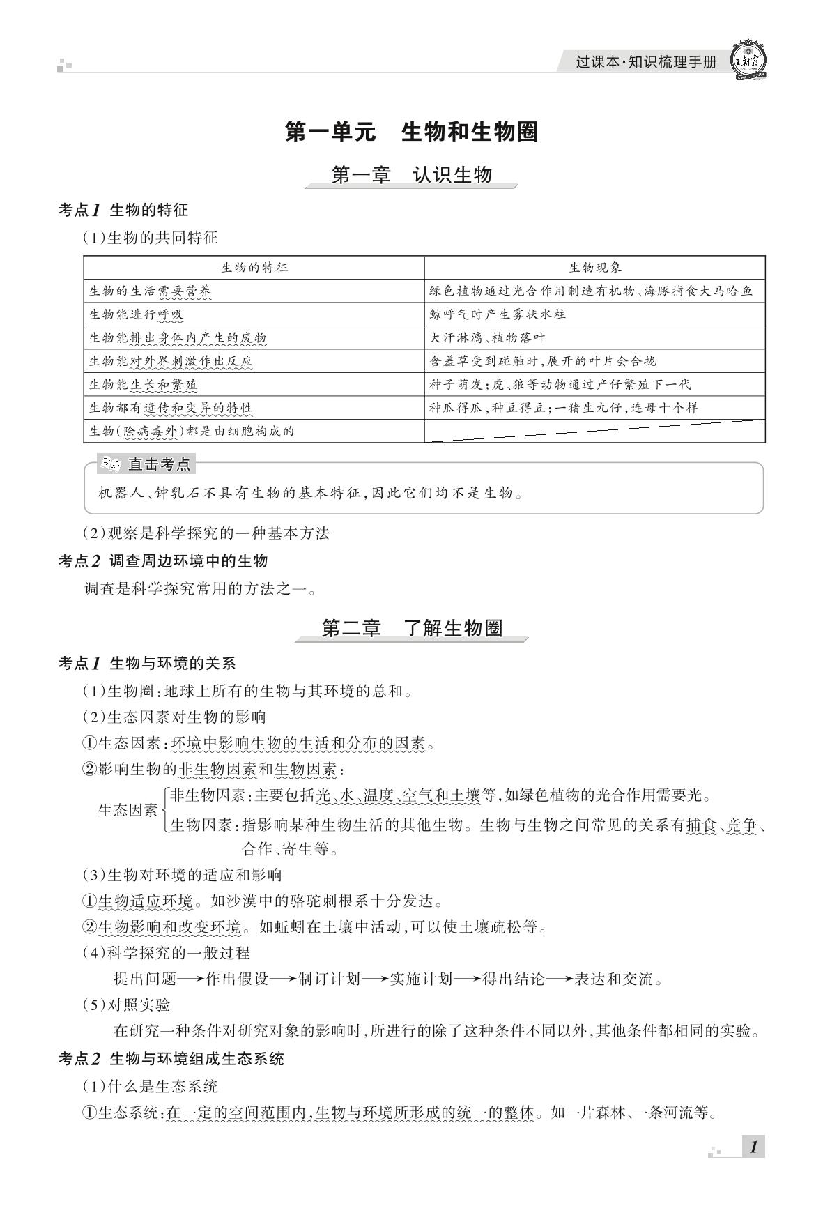 王朝霞期末过课本——知识梳理手册七年级上册生物(人教版)