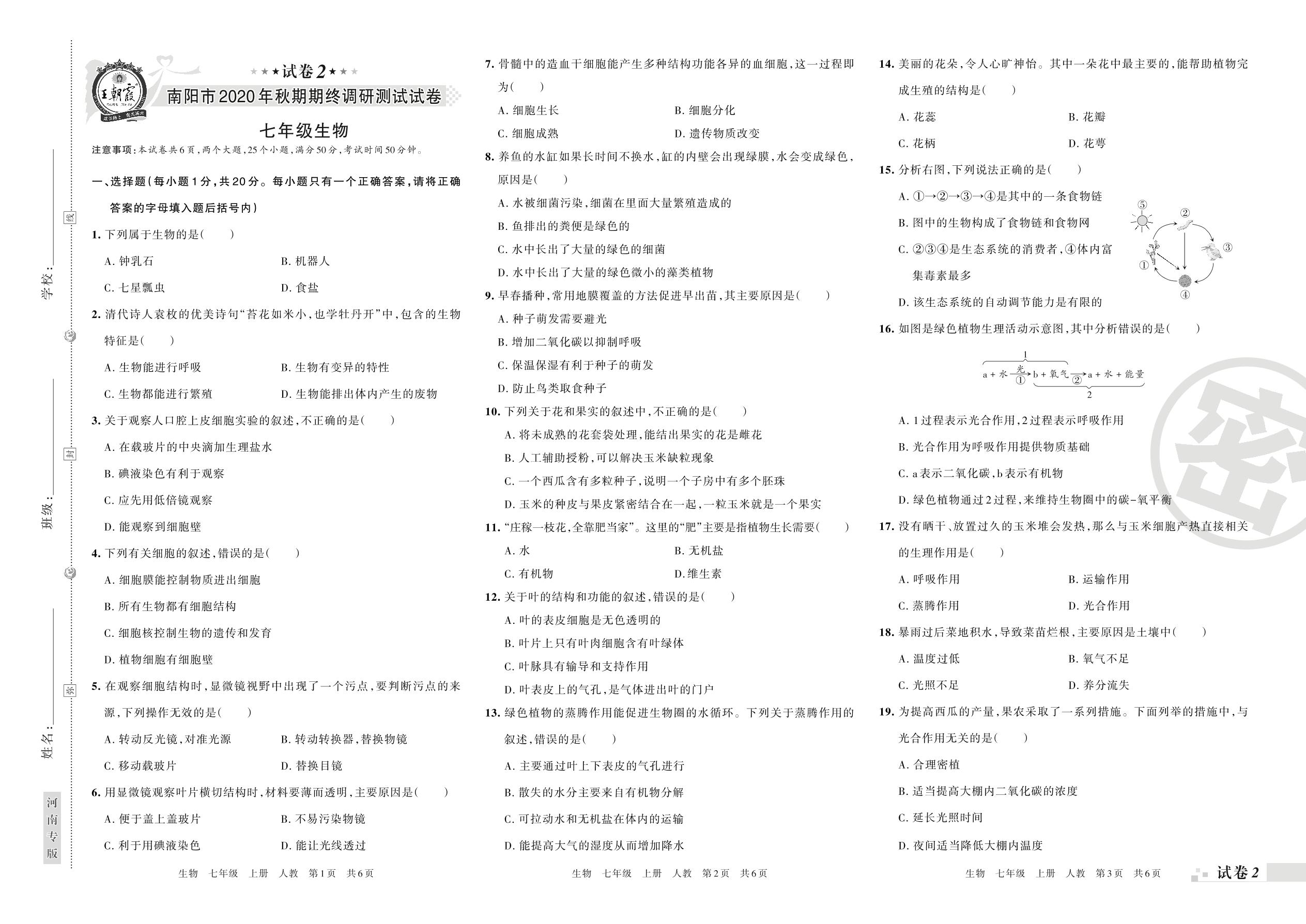 南阳市2020年秋期期终调研测试试卷七年级生物(人教版)【2】