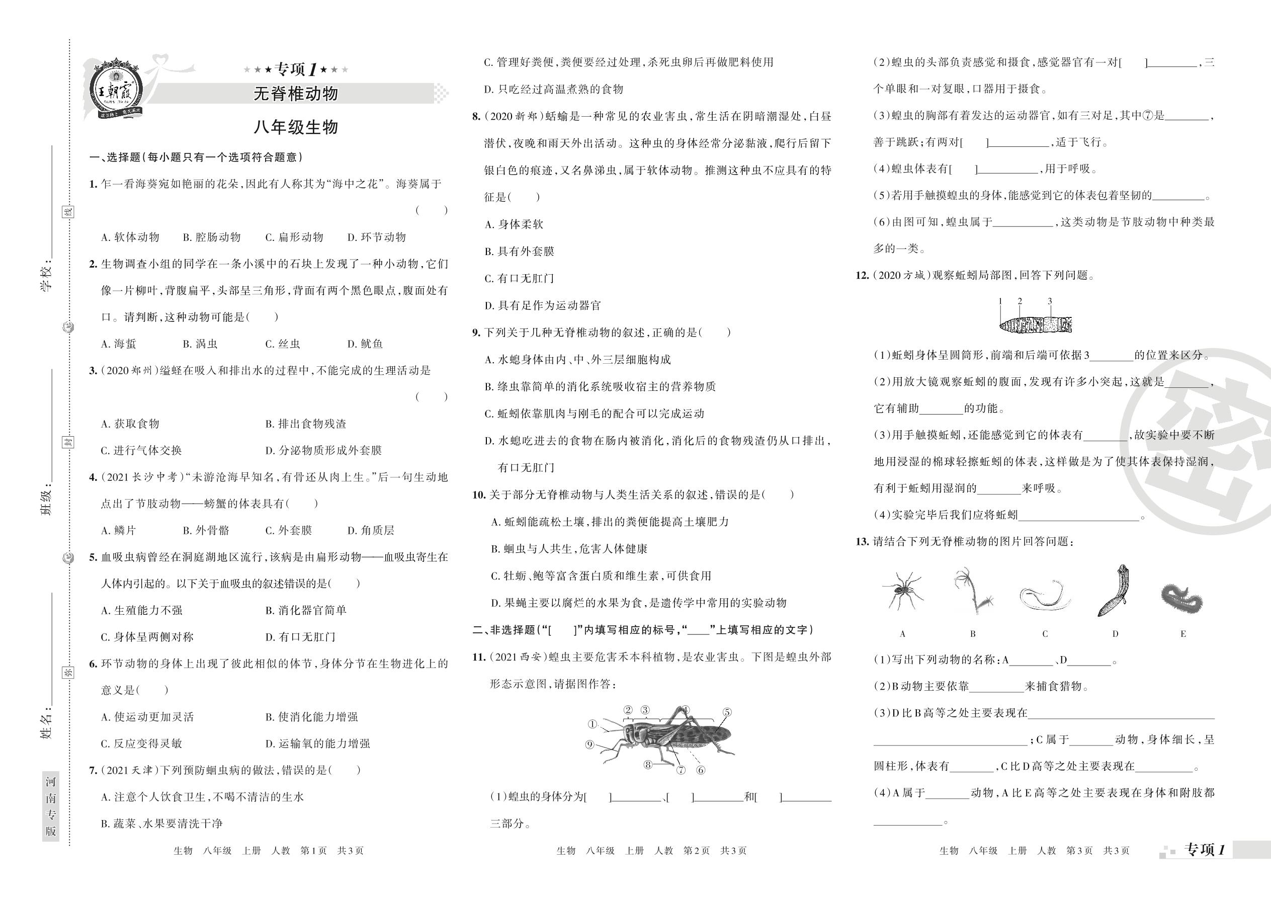 王朝霞期末专项卷——无脊椎动物八年级上册生物(人教版)【1】