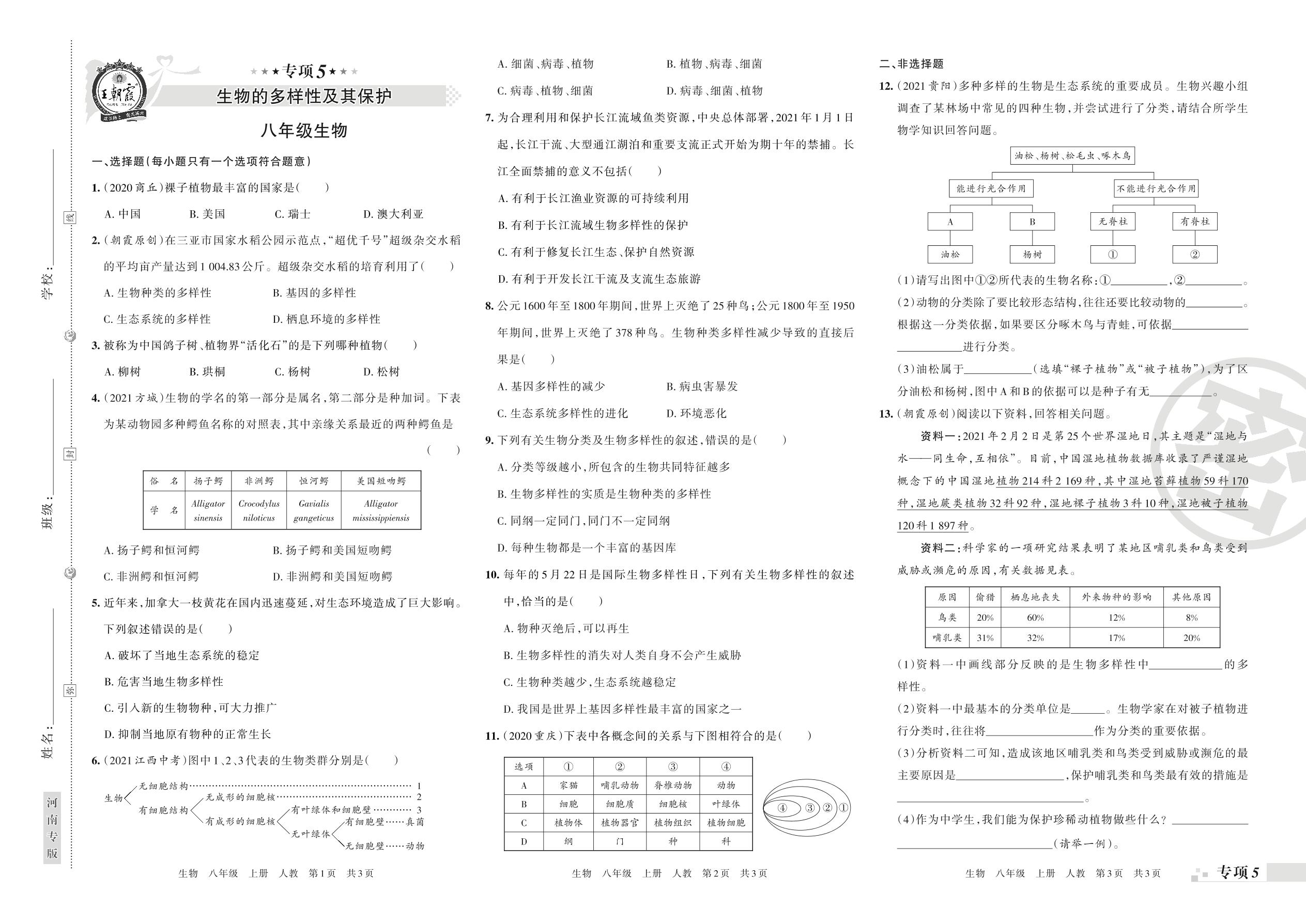 王朝霞期末专项卷——生物的多样性及其保护八年级上册生物(人教版)【5】