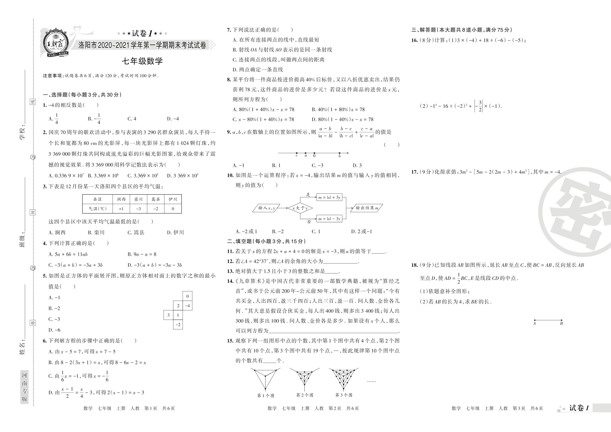 洛阳市2020~2021学年第一学期期末考试试卷七年级数学(人教版)【1】