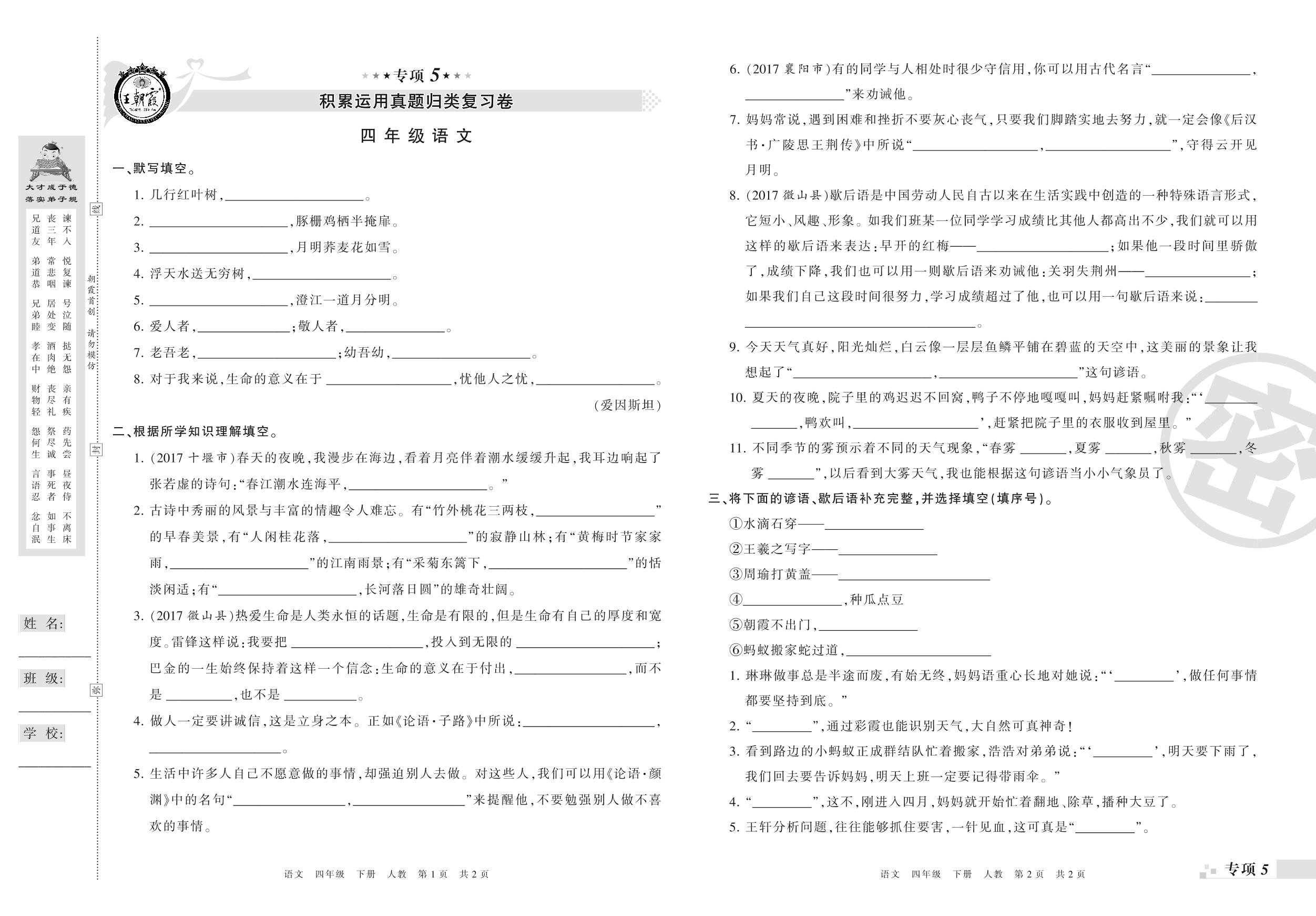 王朝霞期末专项卷——积累运用、课内阅读(一)真题归类复习卷四年级下册语文(人教版)_R210801205210001【0】