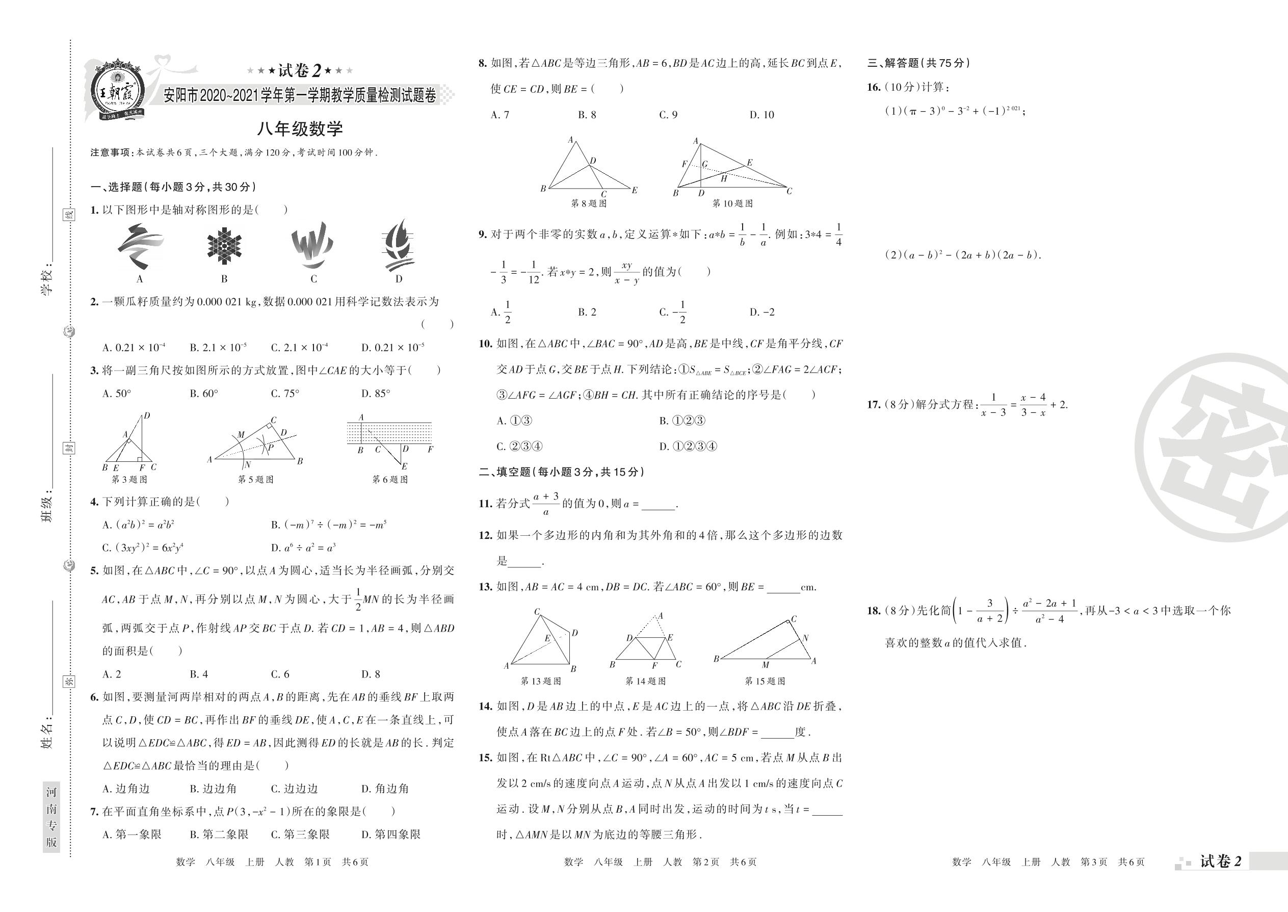 安阳市2020~2021学年第一学期教学质量检测试题卷八年级数学(人教版)【2】