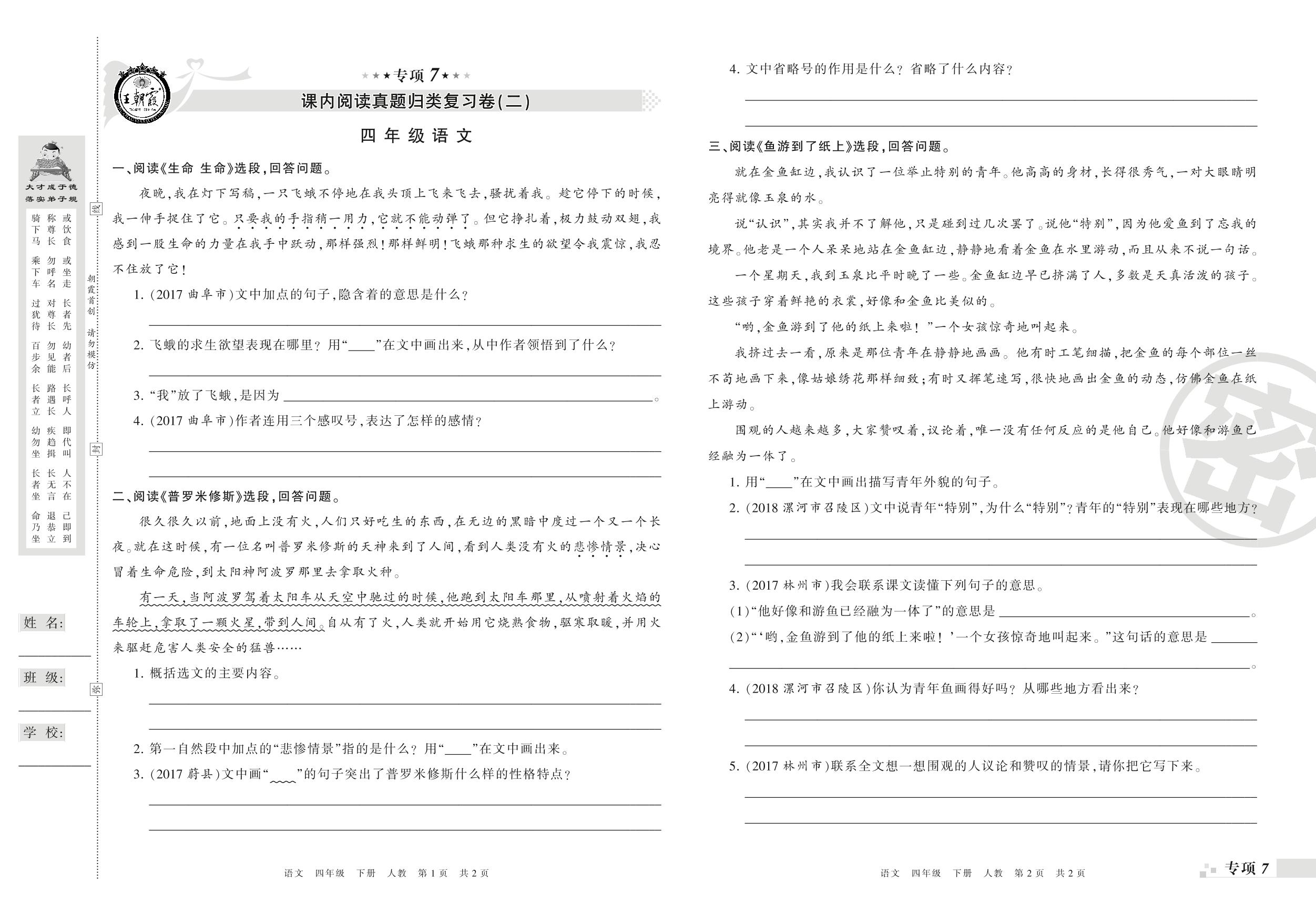 王朝霞期末专项卷——课内阅读(二)、课外阅读与写作真题归类复习卷四年级下册语文(人教版)_R210801205210002【0】