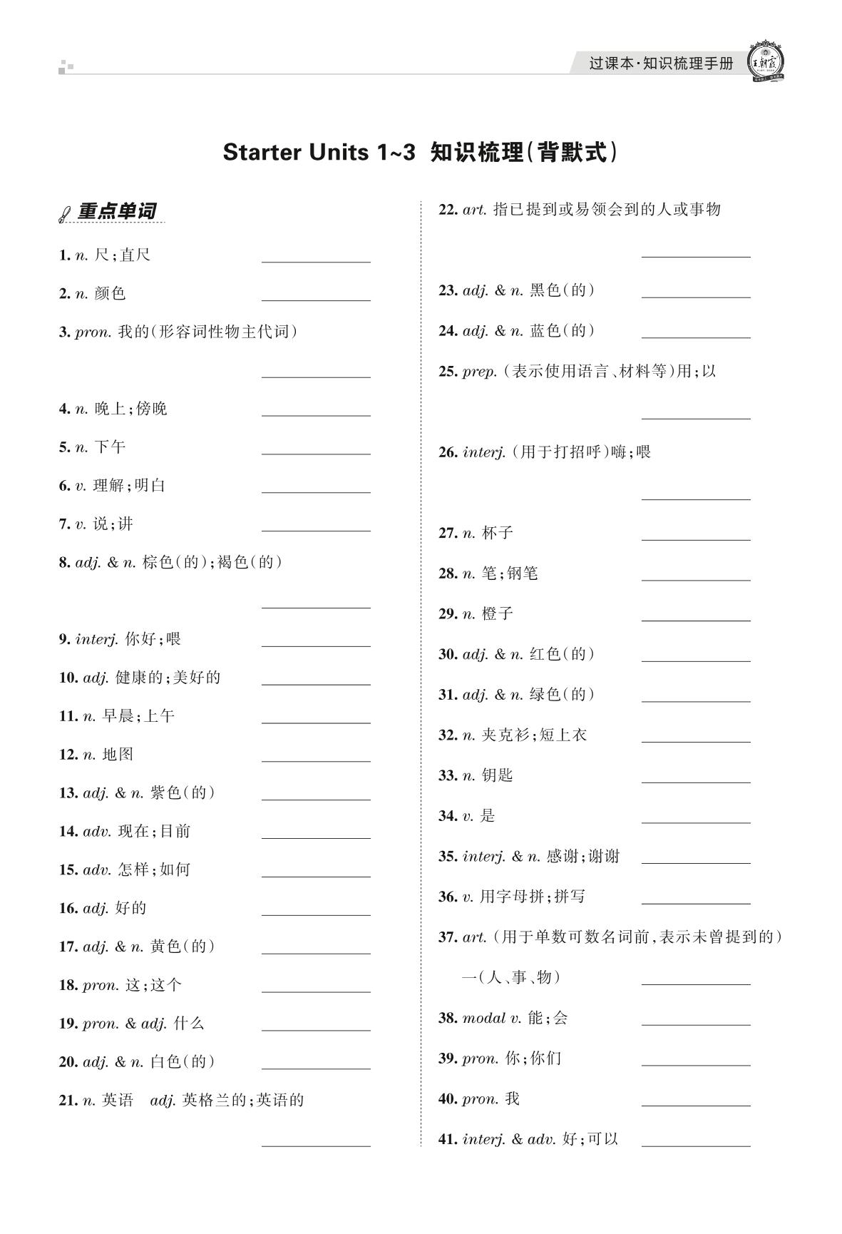 王朝霞期末过课本——Starter Unit 1~3 知识梳理(背默式)七年级上册英语(人教版)【1】