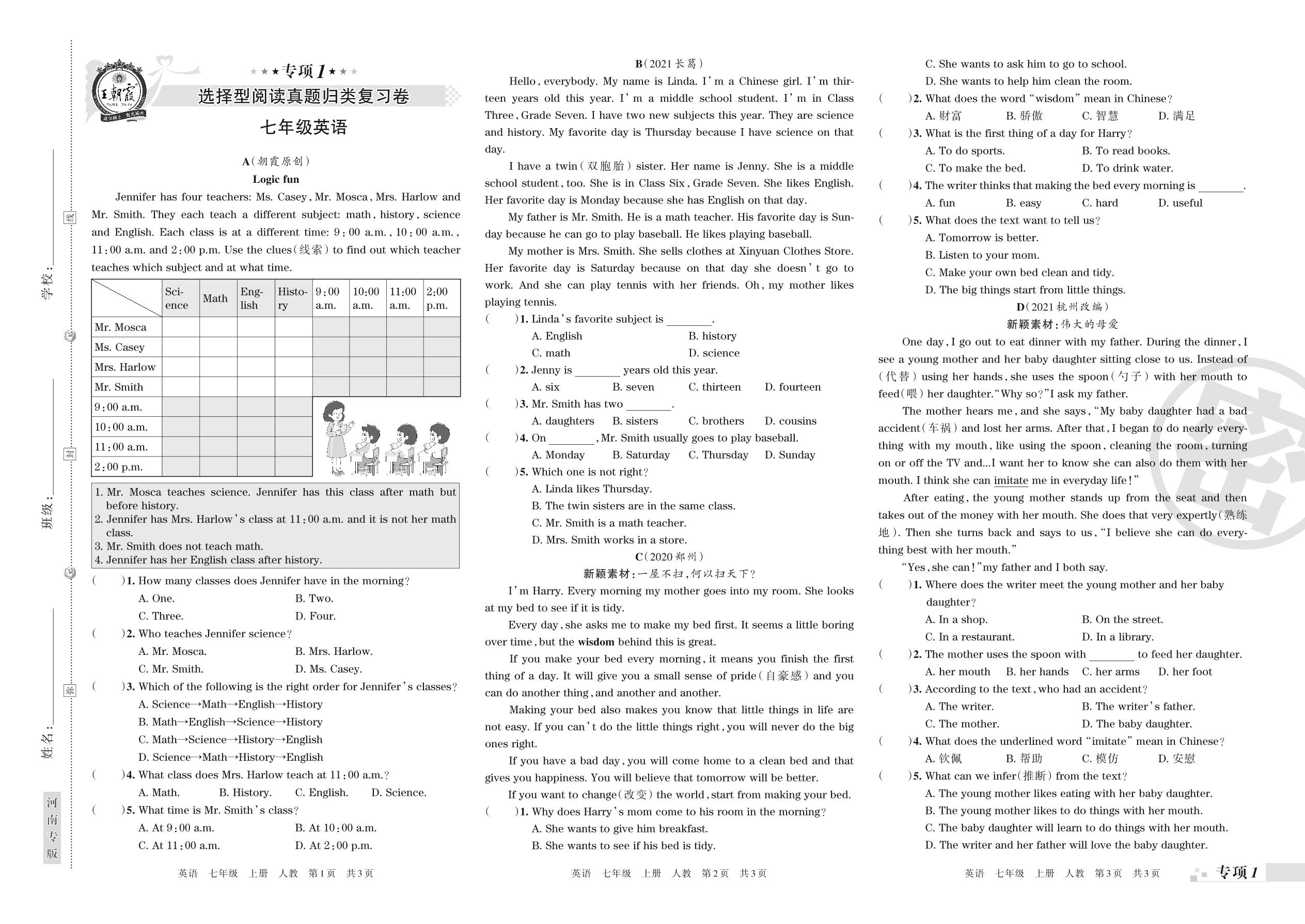 王朝霞期末专项卷——选择型阅读真题归类复习卷七年级上册英语(人教版)_R211206111634628【1】