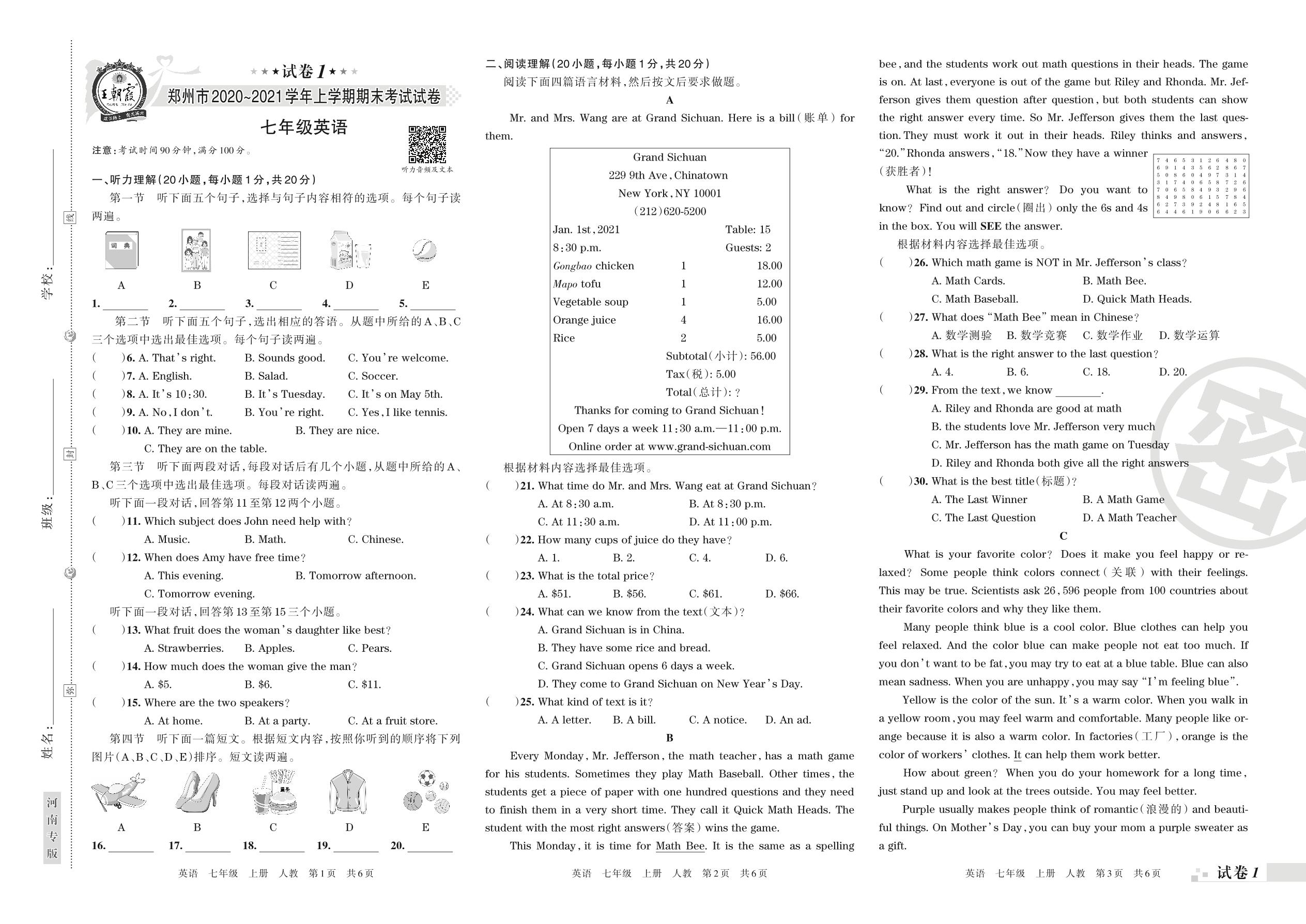 郑州市2020~2021学年上学期期末考试试卷七年级英语(人教版)_R211206111634440【1】